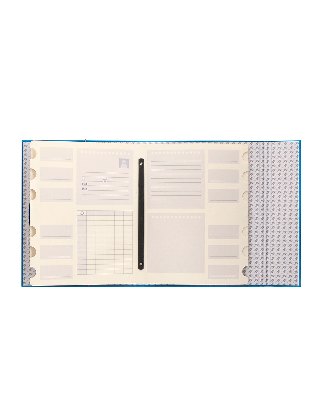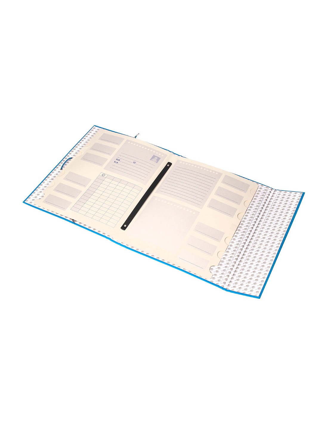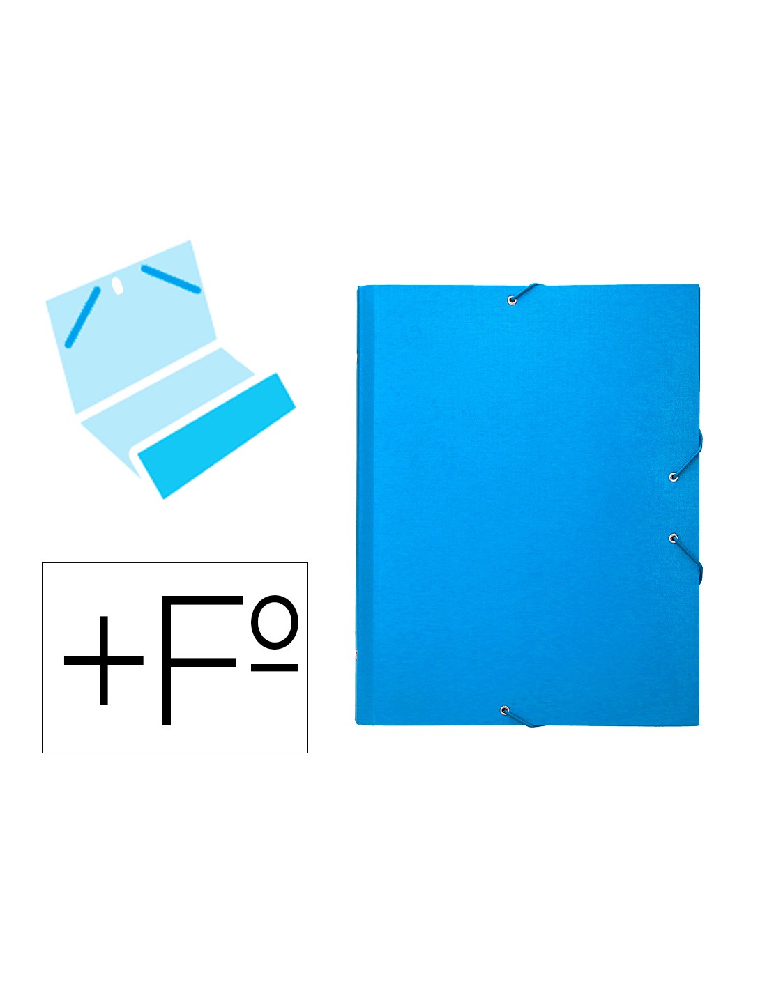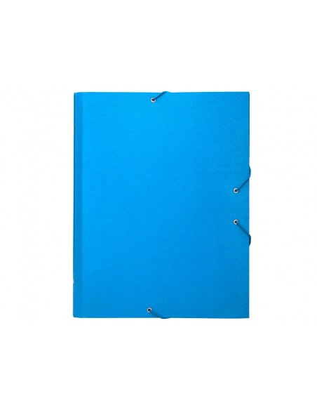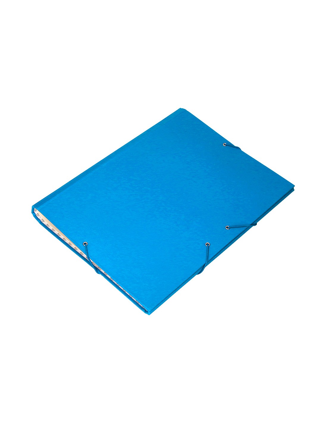 Carpeta fabricada en cartón entrecolado de 1,75 mm de grosor, forrado con papel de encuadernación plastificado, gofrado tela en PVC. Guarda interior impresa. Con solapa. 12 departamentos. Cierre con gomas. Tamaño folio prolongado.