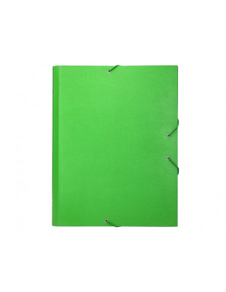 Carpeta fabricada en cartón entrecolado de 1,75 mm de grosor, forrado con papel de encuadernación plastificado, gofrado tela en PVC. Guarda interior impresa. Con solapa. 12 departamentos. Cierre con gomas. Tamaño folio prolongado.
