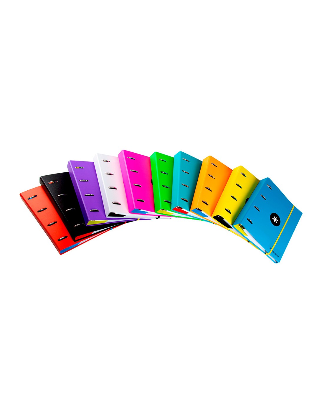 Tapa de cartón forrado de 1,75 mm de espesor. Forrada en papel estucado mate de 135 g/m² impreso. Plastificada mate con detalles barniz UVI. 4 anillas redondas. Cierre de gomilla. Con ranuras para anillas. 100 hojas con 5 bandas de color y 4 taladros. Papel interior extrablanco de 100 g/m². Ultrasuave. Cuadrícula de 5 mm. Formato DIN A4. Guarda interior impresa.