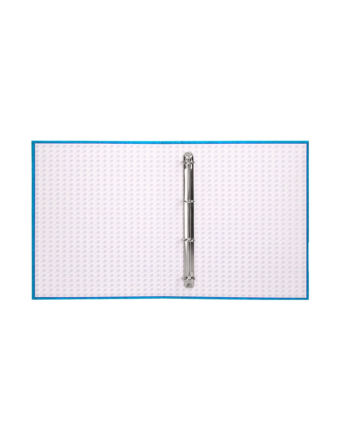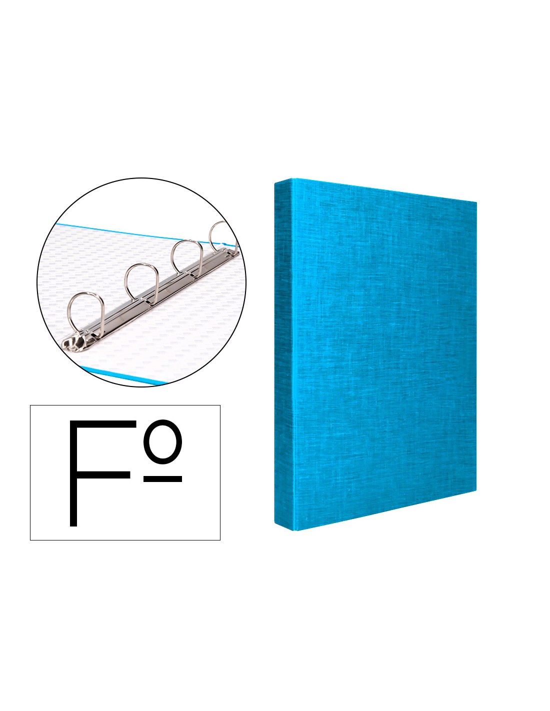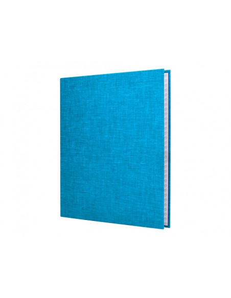 Carpeta cartón entrecolado de 1,75 mm de espesor, forrado con papel de encuadernación plastificado, gofrado tela en PVC. Con anillas mixtas. Tamaño folio. Medidas 260 x 332 mm.