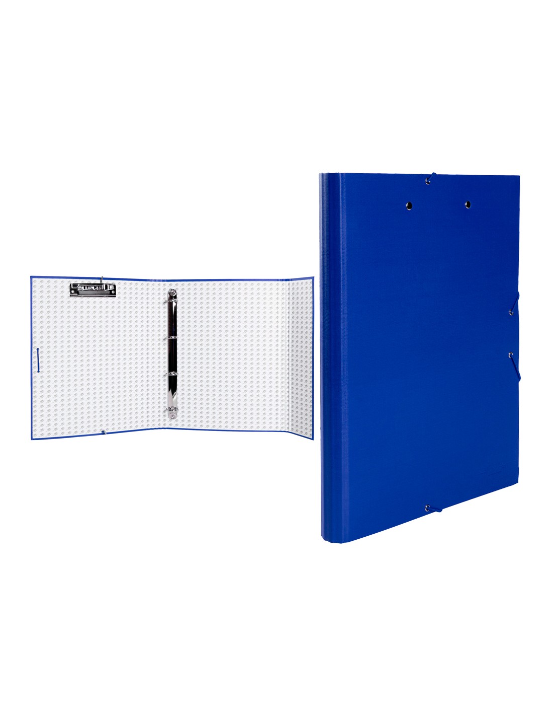 Carpeta de solapas fabricada en cartón entrecolado de 1,75 mm de espesor, forrado con papel de encuadernación plastificado, gofrado tela en PVC. 4 anillas redondas de 25 mm. Cierre de gomilla con solapa y miniclip. Lomo de 40 mm. Tamaño folio. Medidas 260 x 332 mm.