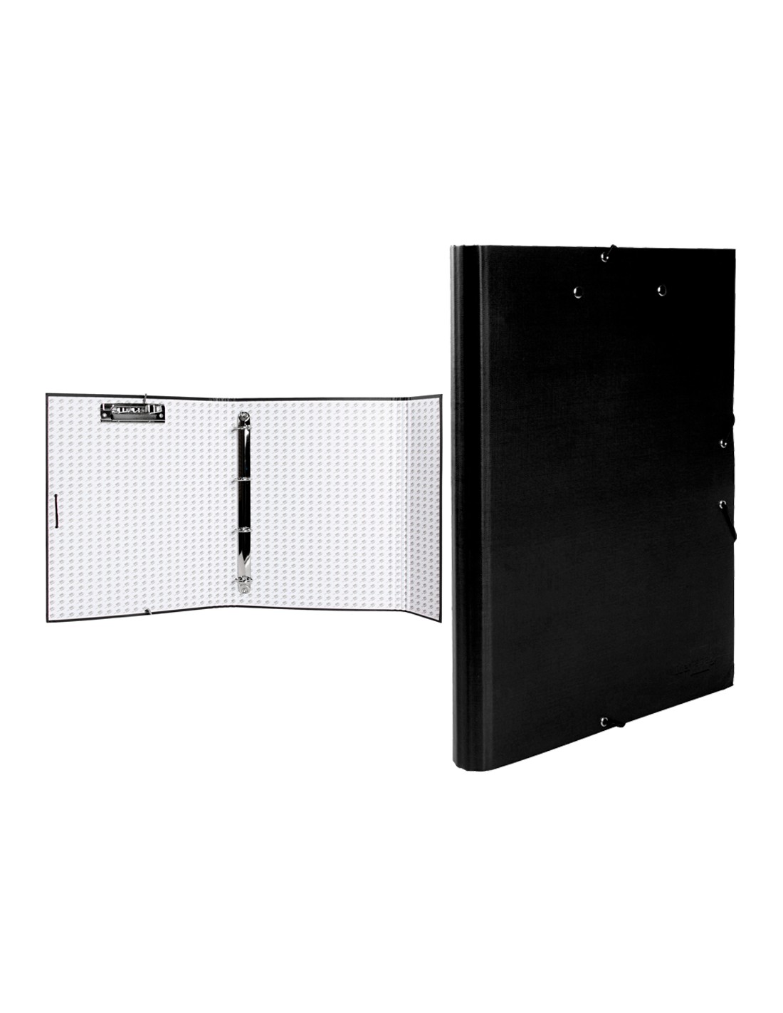 Carpeta de solapas fabricada en cartón entrecolado de 1,75 mm de espesor, forrado con papel de encuadernación plastificado, gofrado tela en PVC. 4 anillas redondas de 25 mm. Cierre de gomilla con solapa y miniclip. Lomo de 40 mm. Tamaño folio. Medidas 260 x 332 mm.