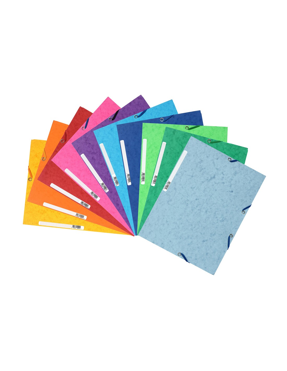 Carpeta de gomas en cartulina lustrada 400 g/m². Cierre con gomas y tres solapas. Etiqueta adhesiva en el lomo. Colores surtidos amarillo, azul, celeste, morado, naranja, rojo, rosa, turquesa, verde hierba y verde pistacho. Formato DIN A4.