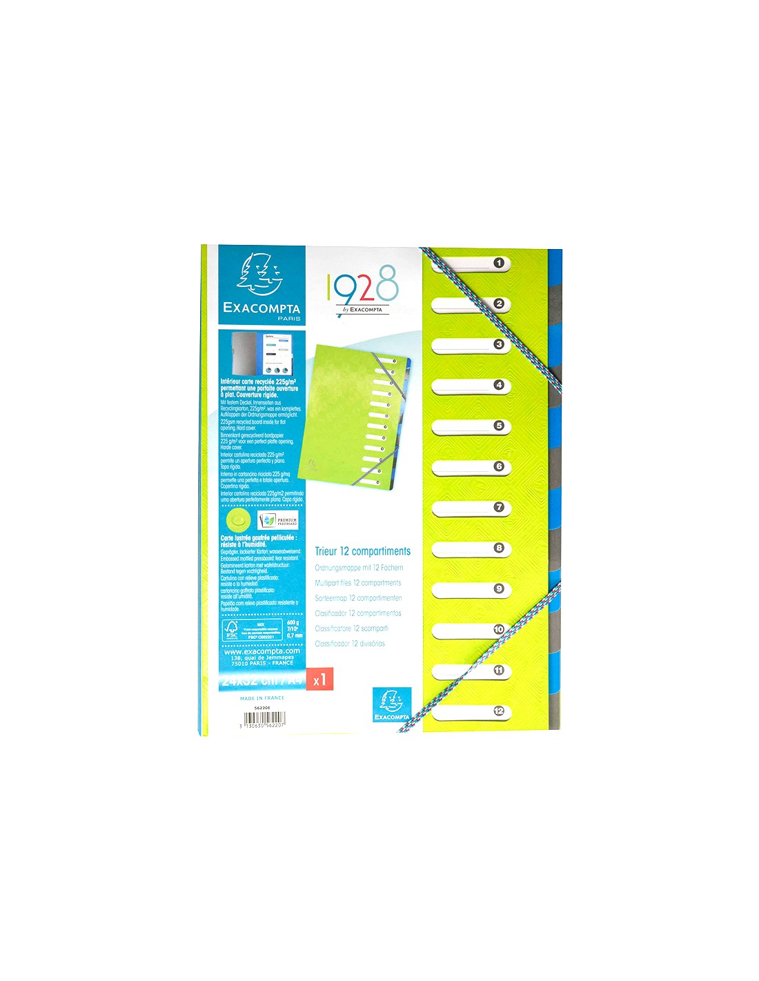 Clasificador con fuelle extensible y gomas. Fabricación en cartulina de fibras vegetales. Grosor de 600 g/m². 12 compartimentos con capacidad para 100 hojas cada uno. Formato DIN A4. Colores surtidos.