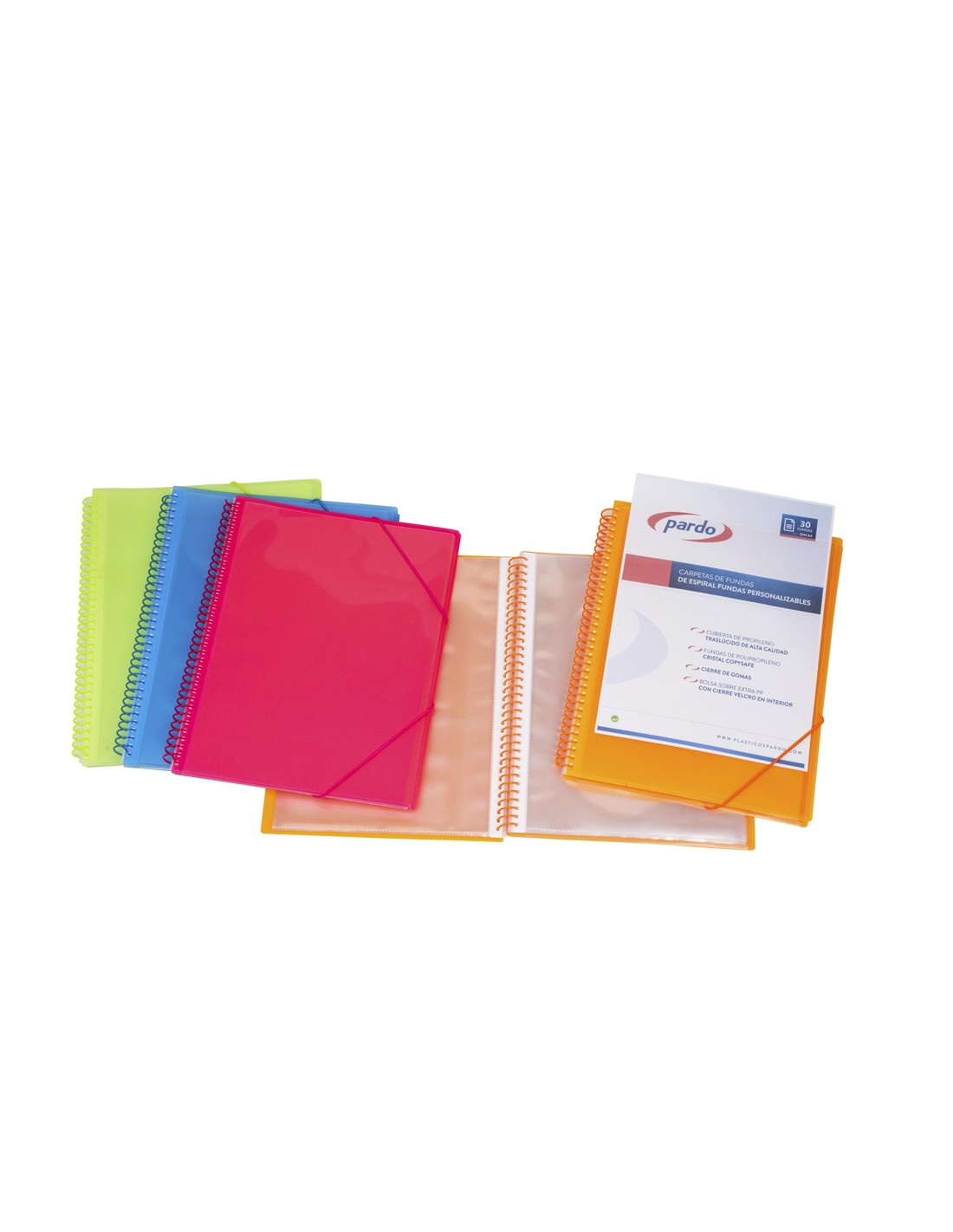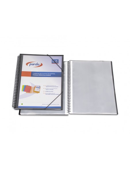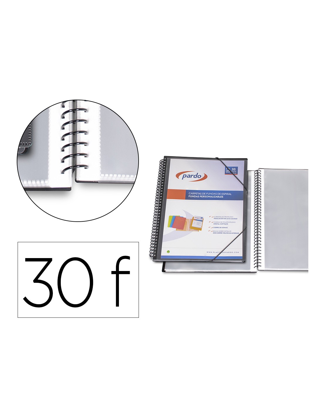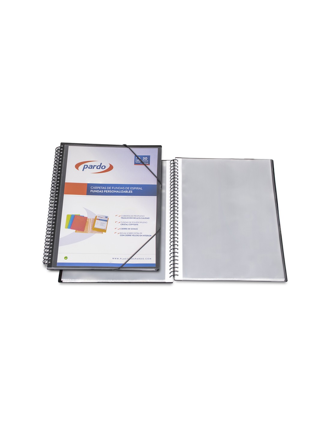 Carpeta espiral 30 fundas con tapas personalizables. Con fundas interiores cristal 90 micras y sobre. Cierre de gomas. Color negro.
