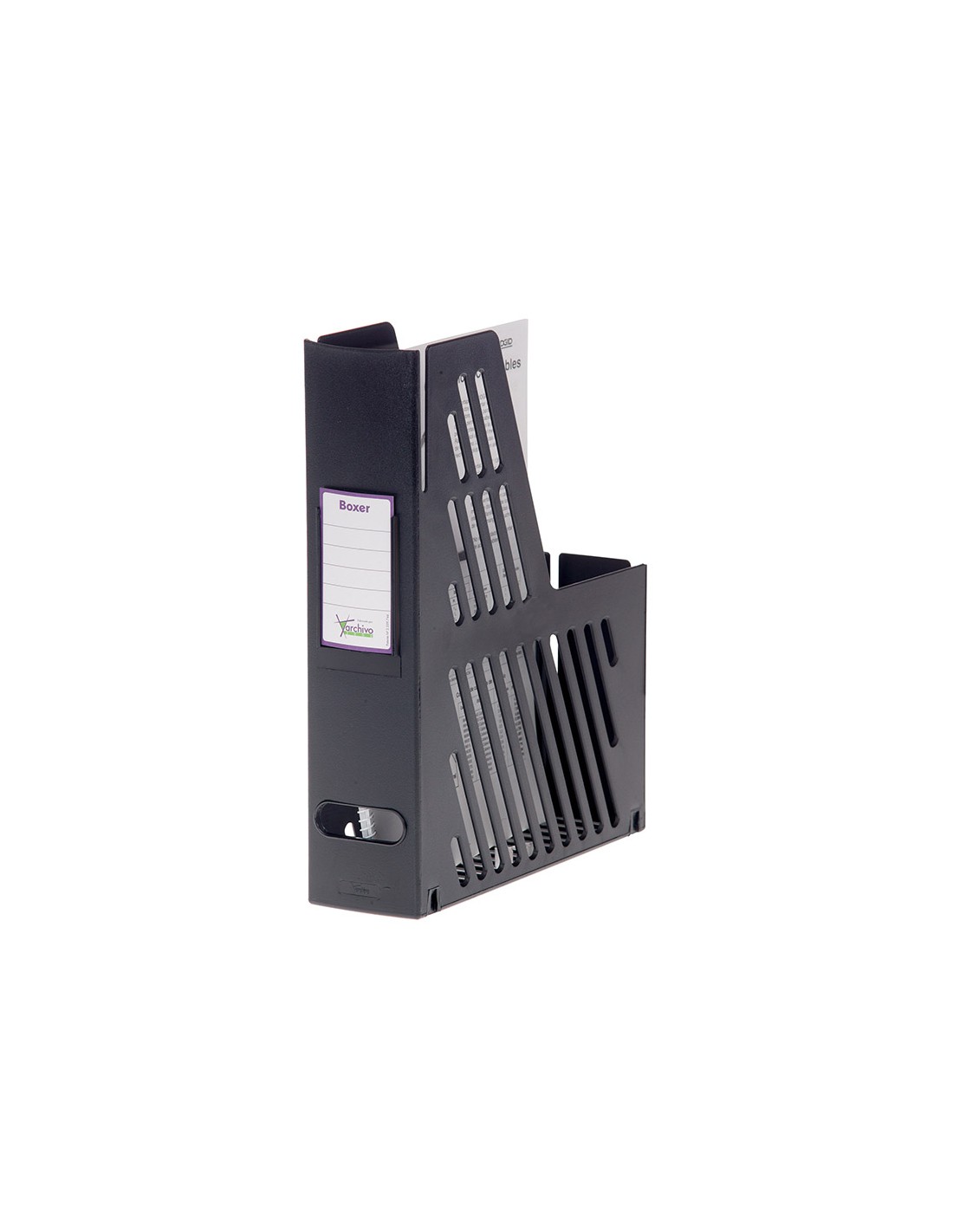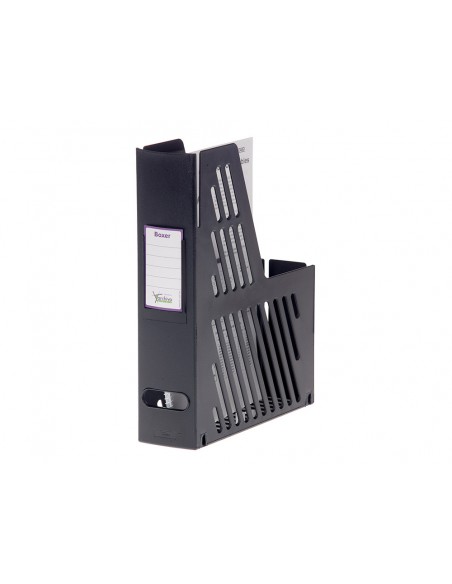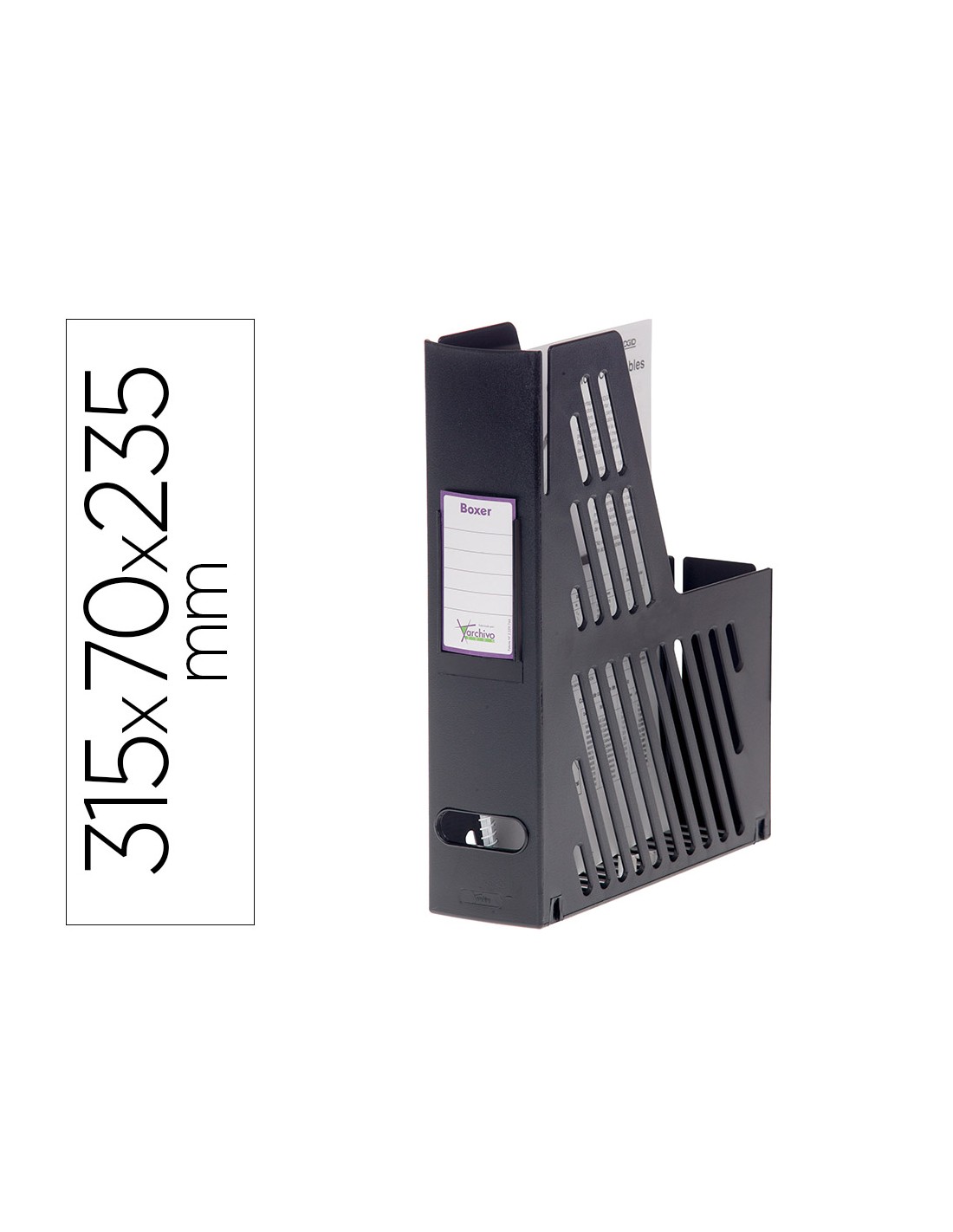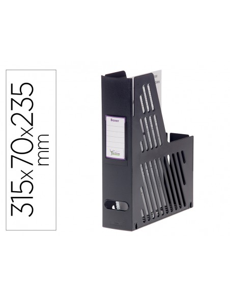 Revistero que permite localizar y visualizar el contenido fácilmente, especialmente para archivar catálogos, revistas, etc. Con tarjetero identificador en el lomo. Medidas 235 x 315 x 70 mm.