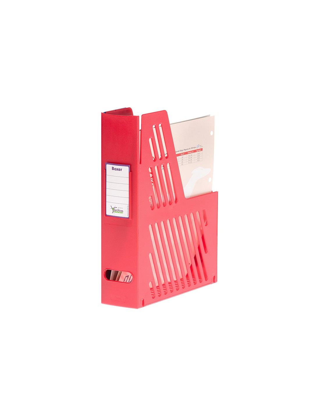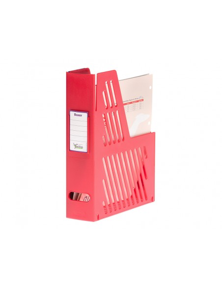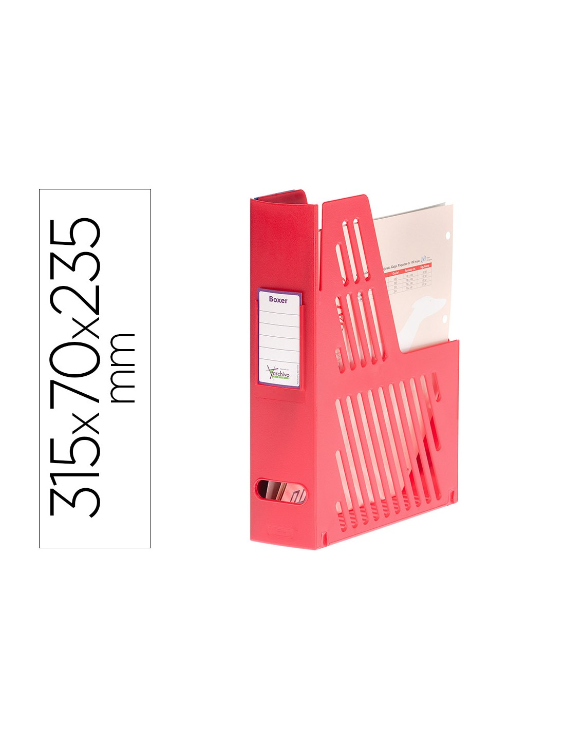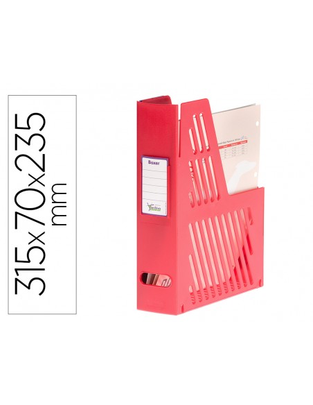 Revistero que permite localizar y visualizar el contenido fácilmente, especialmente para archivar catálogos, revistas, etc. Con tarjetero identificador en el lomo. Medidas 235 x 315 x 70 mm.