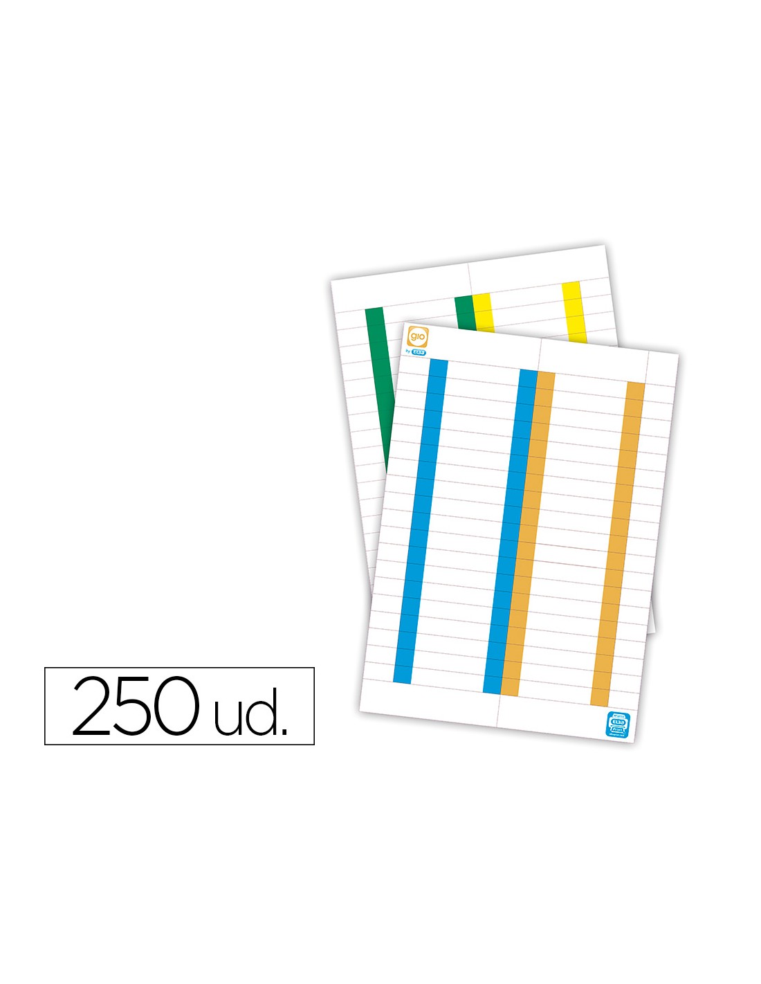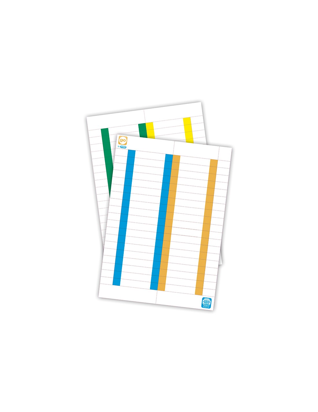 Etiquetas pretroqueladas con bordes en azul, naranja, verde y amarillo. Para carpetas colgantes de visor superior de 80 mm de largo. Personalizables en www.elbaprint.es. Paquetes de 10 hojas de 25 etiquetas.