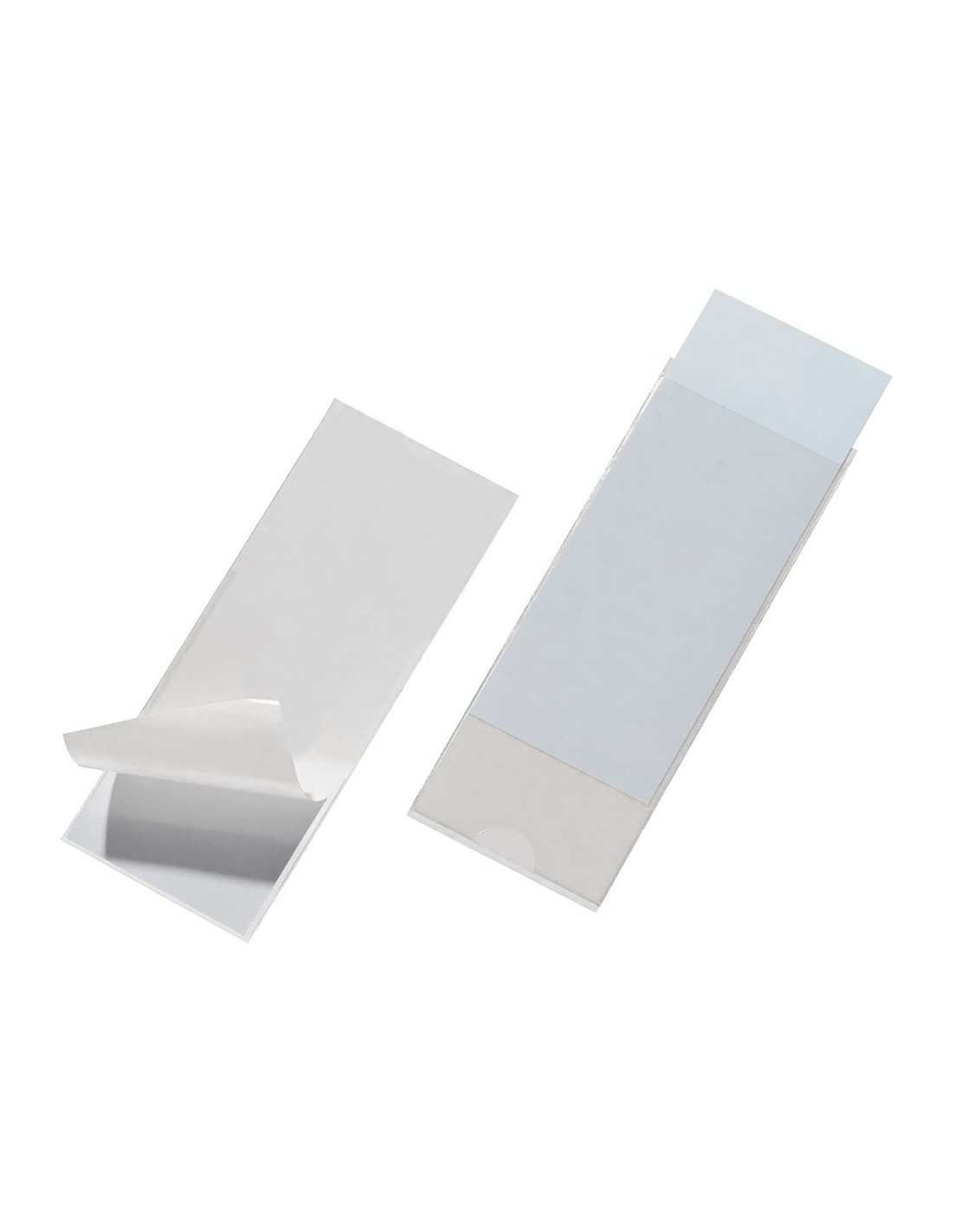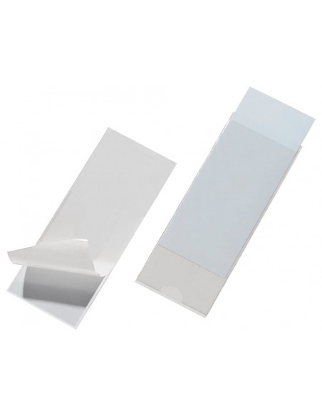 Tarjetero autoadhesivo para lomos de carpetas con etiqueta incluida. Medidas 55 x 102 mm.