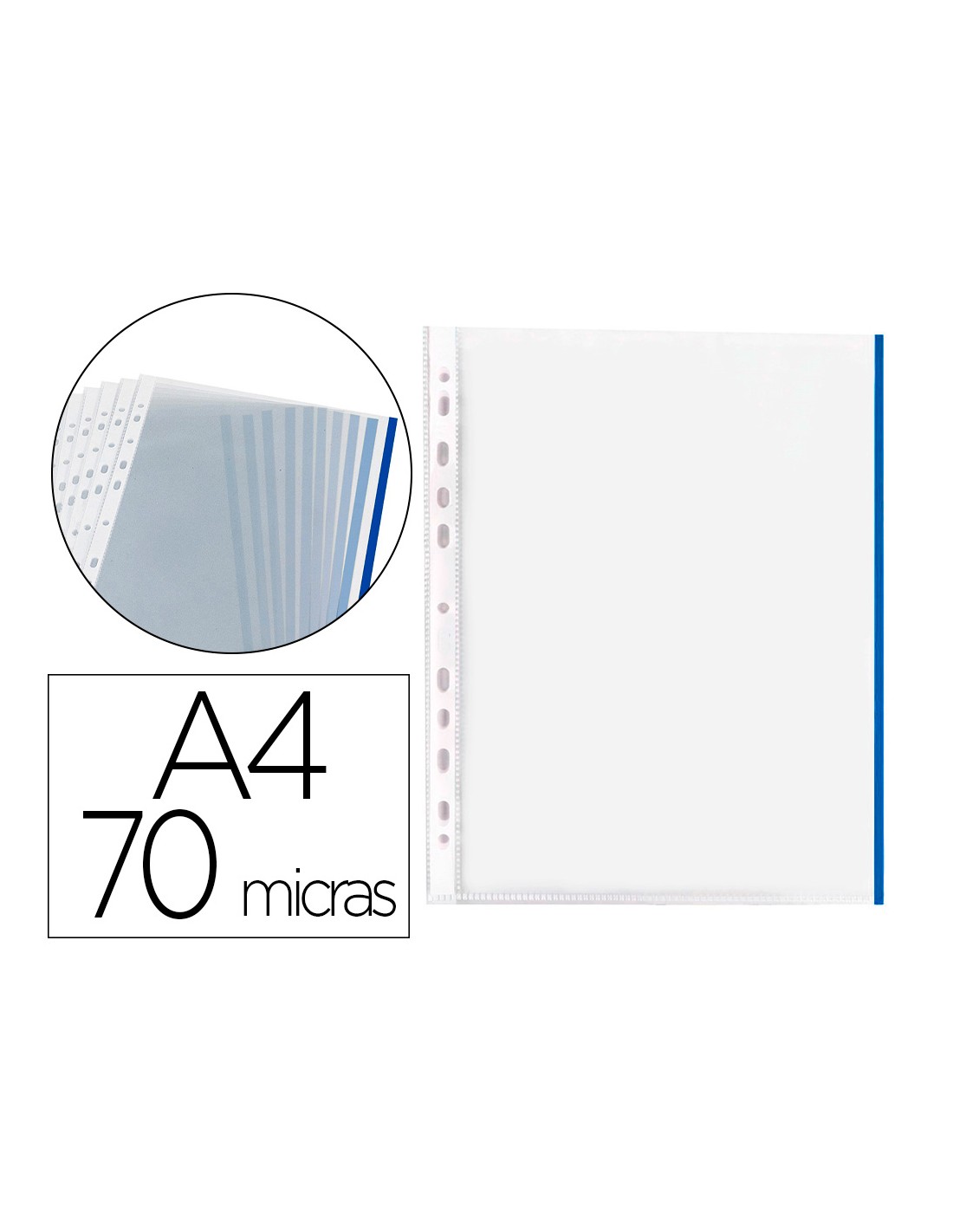 Funda para la protección y archivo de documentos. Con borde de color que ayuda a clasificar y distinguir la información. Fabricada en polipropileno cristal liso. 8 taladros. Grosor 70 micras. Colores amarillo, azul, negro, rojo y verde. Formato DIN A4. La bolsa de 10 unidades.