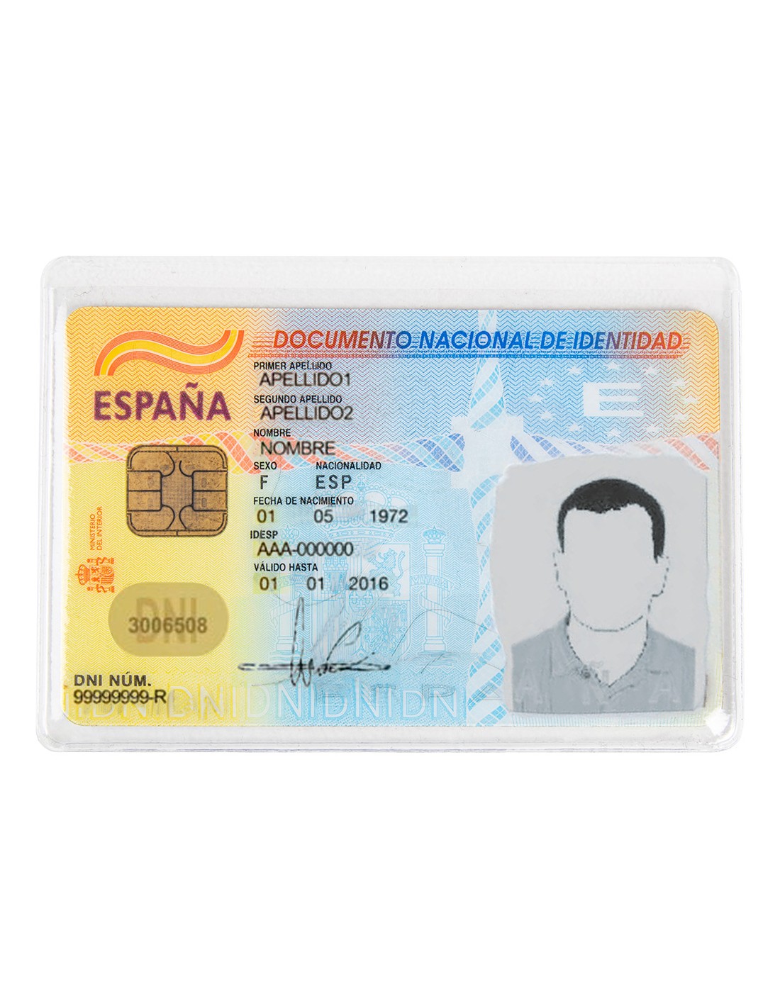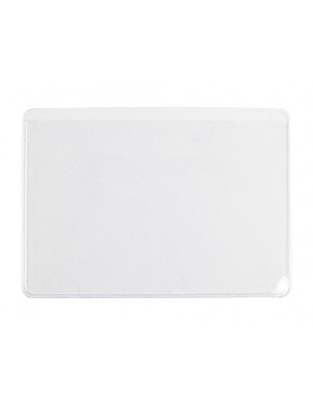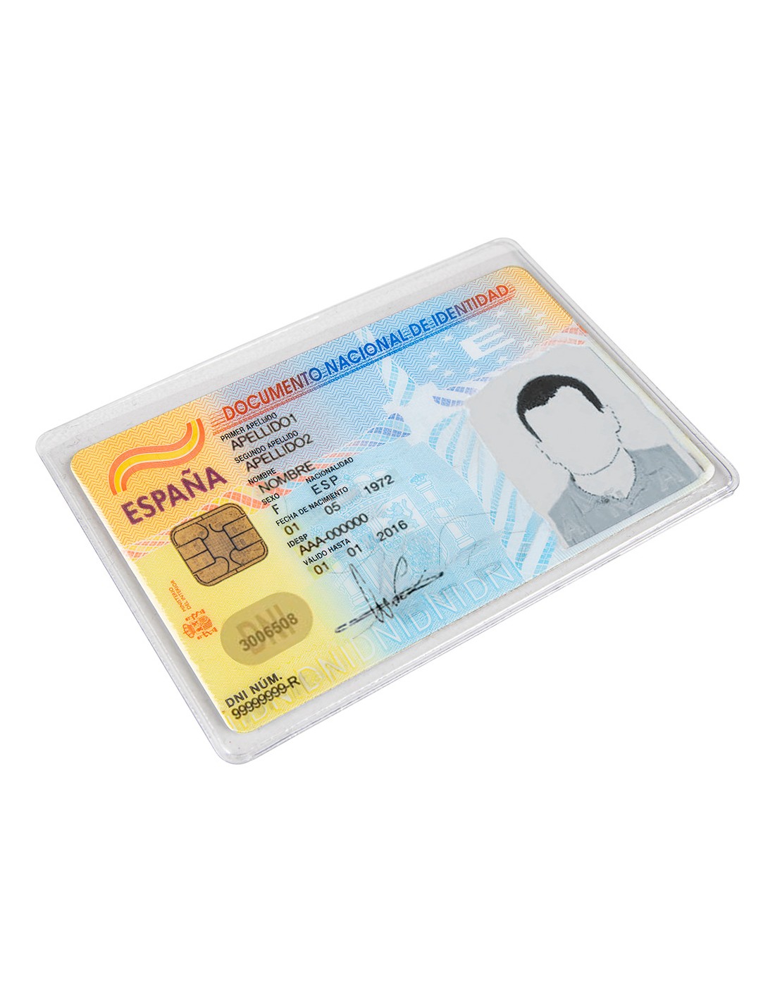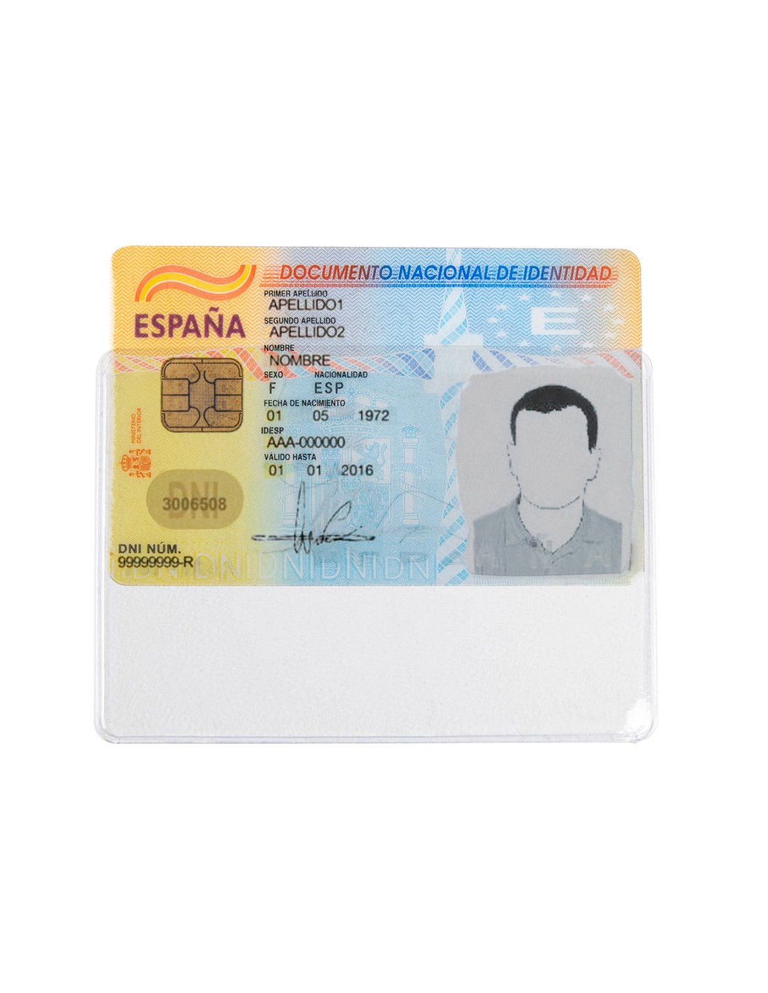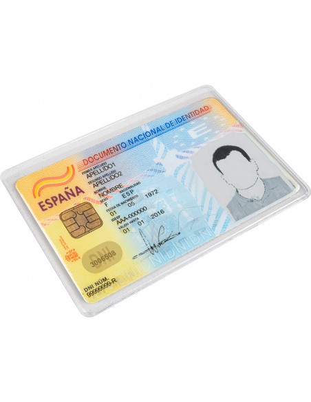 Fabricada en PVC. Con abertura superior y lateral. Con uñero. Color cristal transparente. Formato DNI. 130 micras.