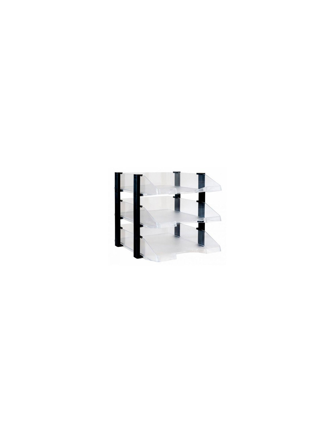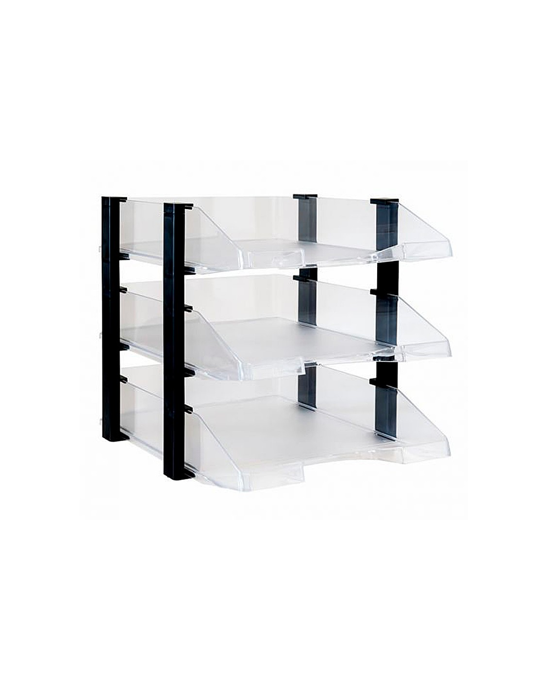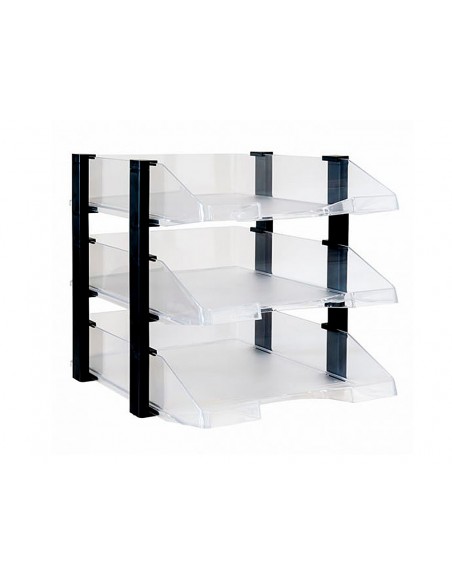 Set de 3 bandejas en color cristal transparente, con elevadores en color negro. El espacio entre las bandejas facilita el acceso a los documentos. Bandejas válidas para formatos DIN A4 y folio. Medidas 255 x 65 x 350 mm.