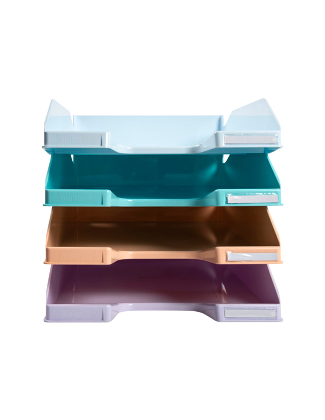 Aquarel - Set de 4 bandejas de correo COMBO MIDI para documentos hasta A4+. Suministrado con 12 elementos de superposición para poder aumentar la capacidad de archivo de documentos. Resistente y estable. Superponibles a lavertical o en forma de escalera. Van con portaetiqueta con etiquetas sumi nsitradas. Colores gama Aquarel Pastel 4 colores surtidos. Coral, Azul, Verde y Malva.
