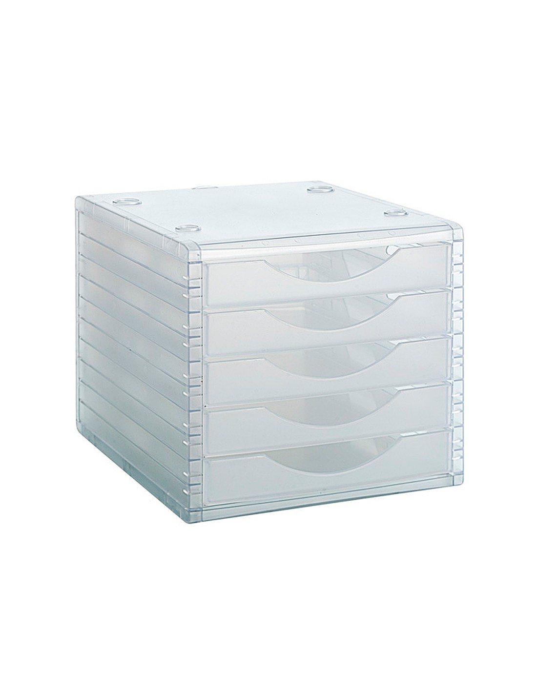 Módulo de 5 cajones. Carcasa color cristal translúcido. Medidas interiores de cajones 234 x 38 x 323 mm. Apilamiento perfecto con la simple colocación de un módulo de cajones sobre otro. Cajones con tope de seguridad y suave deslizamiento. Válidos para formatos DIN A4, folio y subcarpetas. Color transparente. Medidas 270 x 340 x 260 mm.