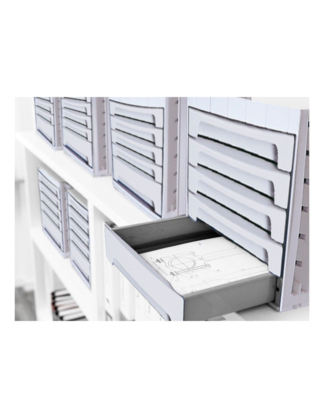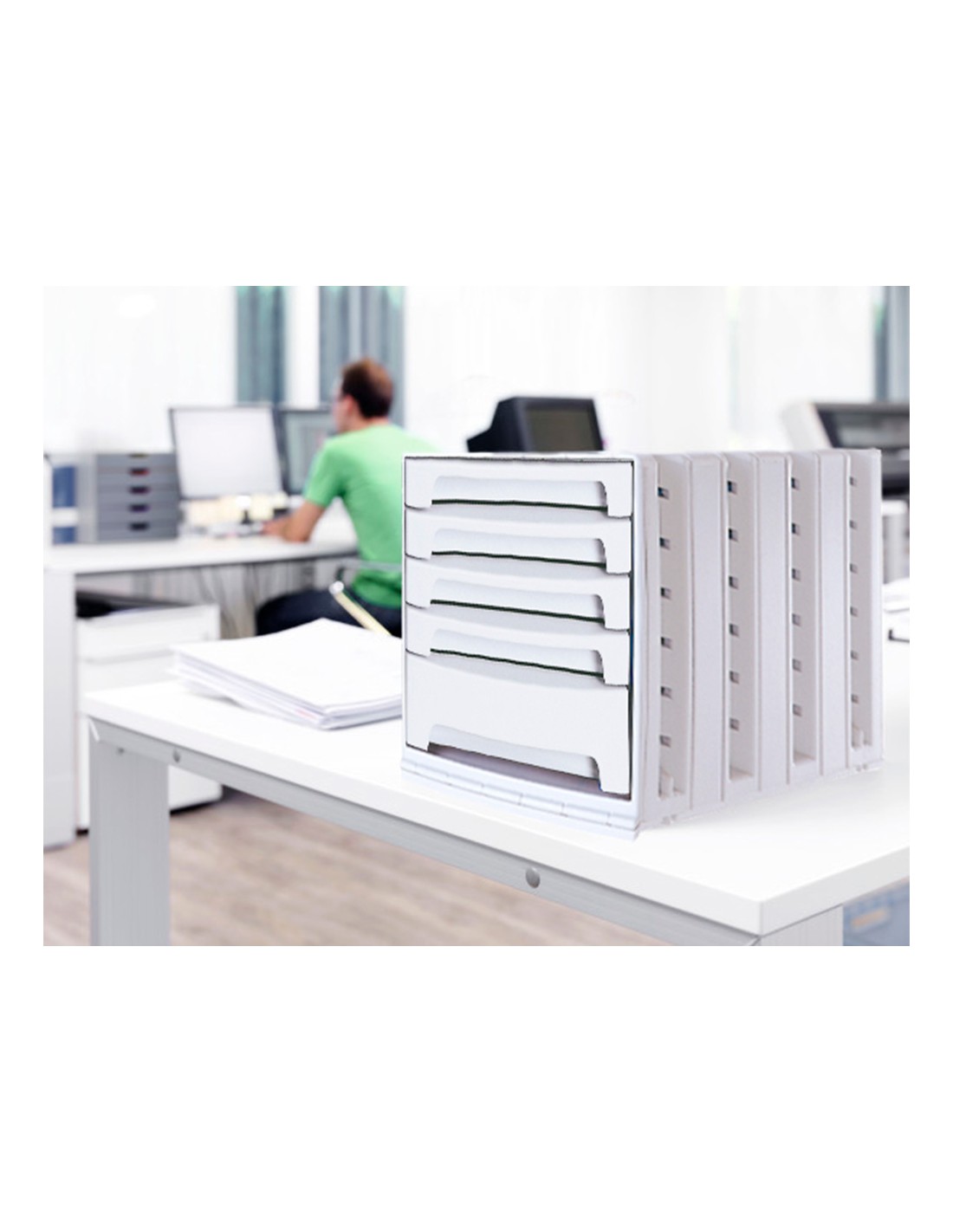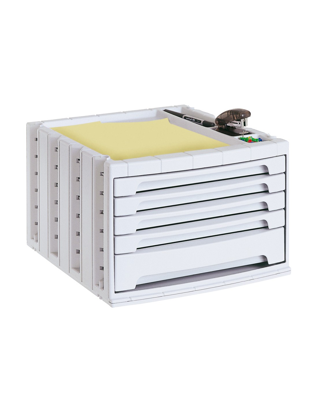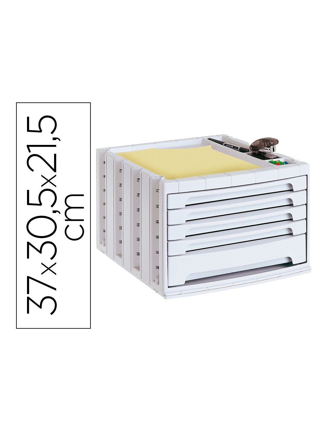 Módulos de cajones apilables y con tope de seguridad para evitar que se caigan al abrirlos. Suave deslizamiento. Agujero en la base para una fácil extracción de los documentos. Acepta documentos de hasta 270 x 320 mm. Incluye bandeja organizadora en la parte superior para tener siempre a mano los accesorios de oficina. Su diseño ergonómico y funcional facilita un apilamiento muy estable con la simple colocación de un módulo sobre otro. Medidas 305 x 215 x 370 mm.