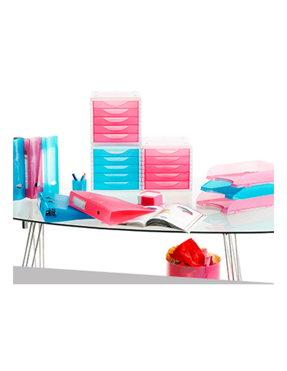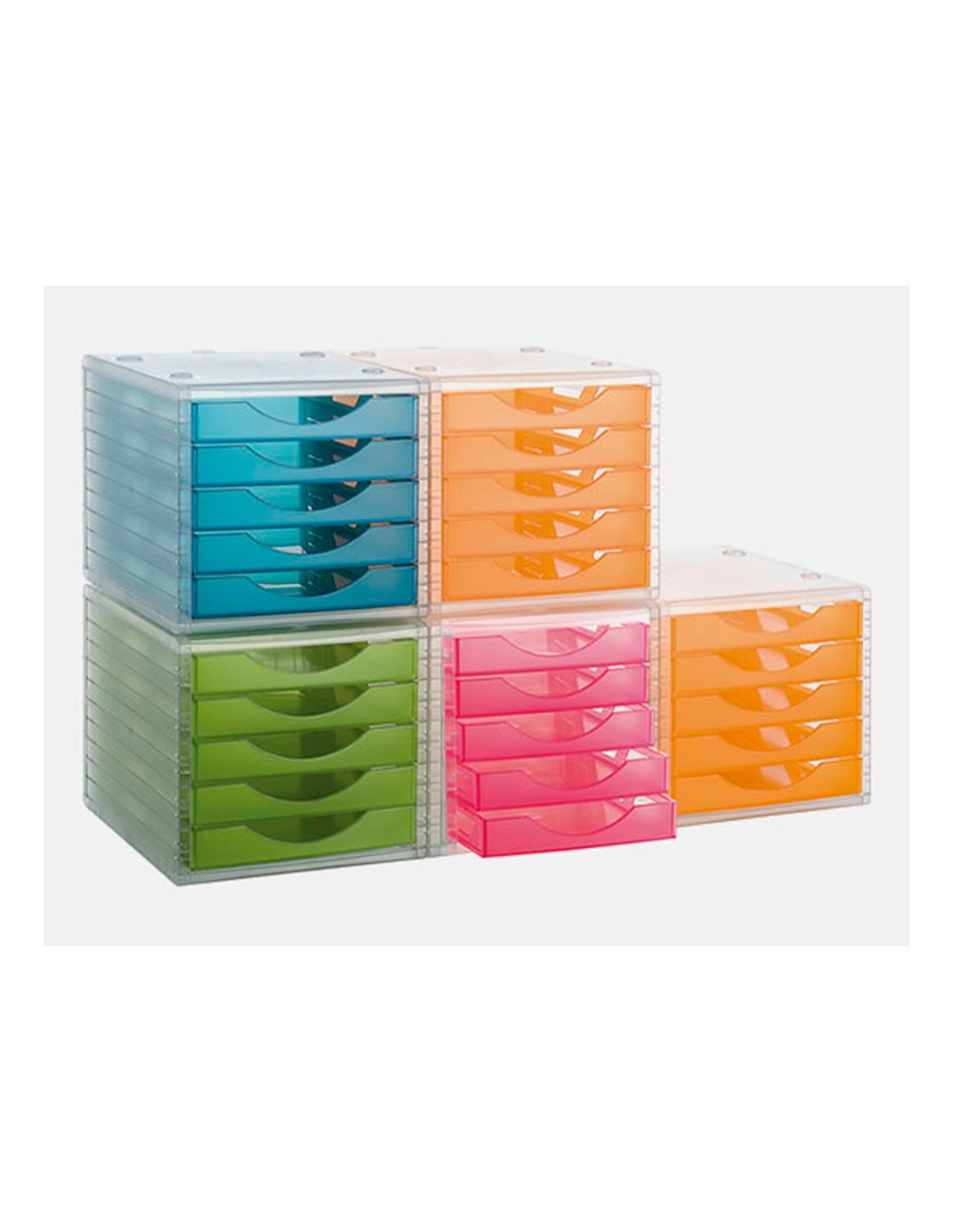 Módulos con carcasa transparente y 5 cajones en una gama de colores traslúcidos. Apilables con la simple colocación de un módulo sobre otro. Cajones con tope de seguridad y suave deslizamiento. Válido para formatos DIN A4, folio y subcarpetas. Medidas 255 x 270 x 340 mm.