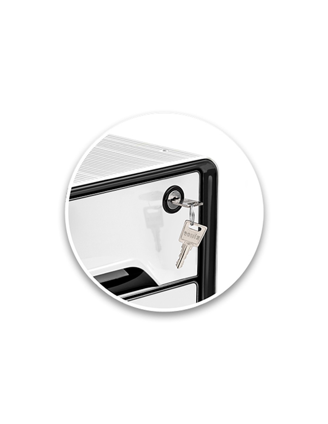 ORGANIZADOR DE SOBREMESA EN COLOR BLANCO Y NEGRO, CON 4 CAJONES Y CERRADURA. MEDIDAS 288X360X270MM. MATERIAL PLÁSTICO
