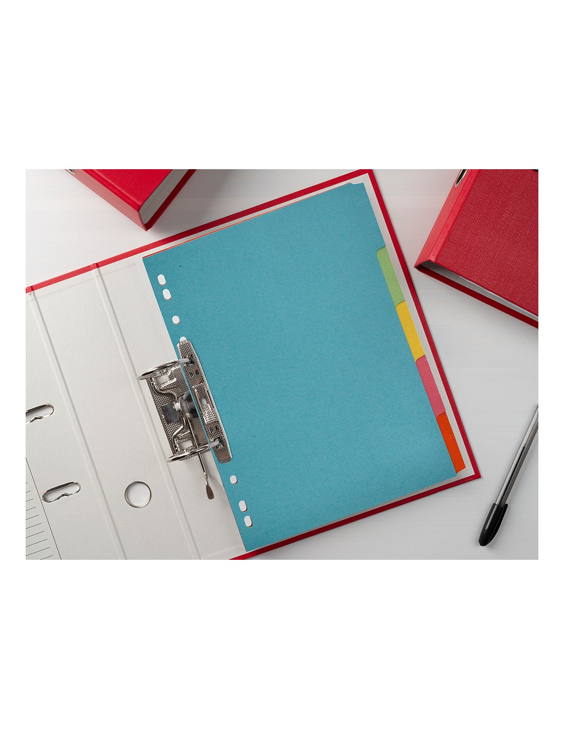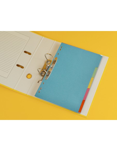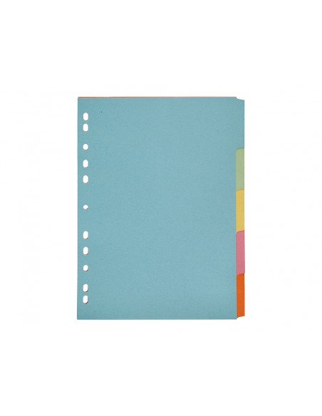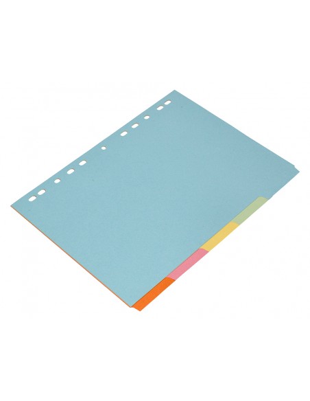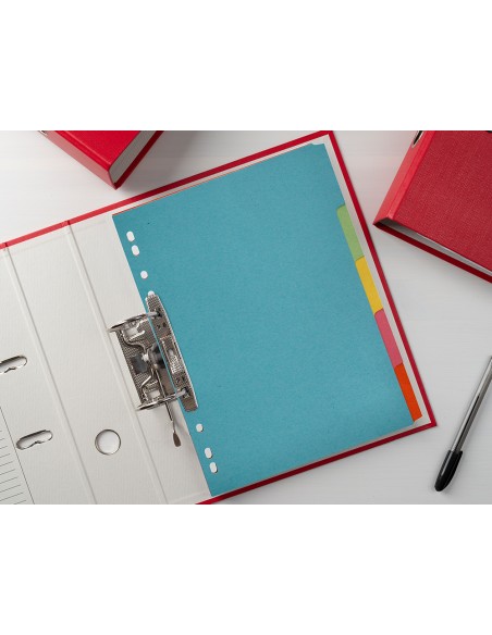 Juego de separadores fabricados en cartón de 175 g/m². Pestañas en colores pastel. Para archivar en diferentes mecanismos de anillas. Incluye carátula con índice.