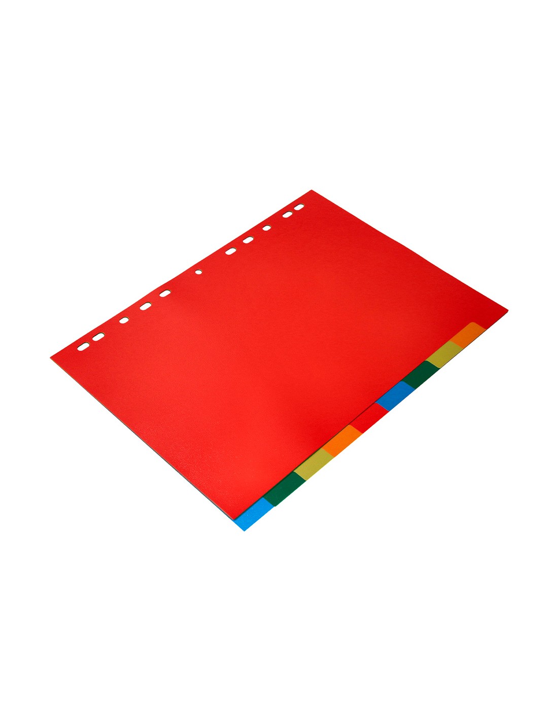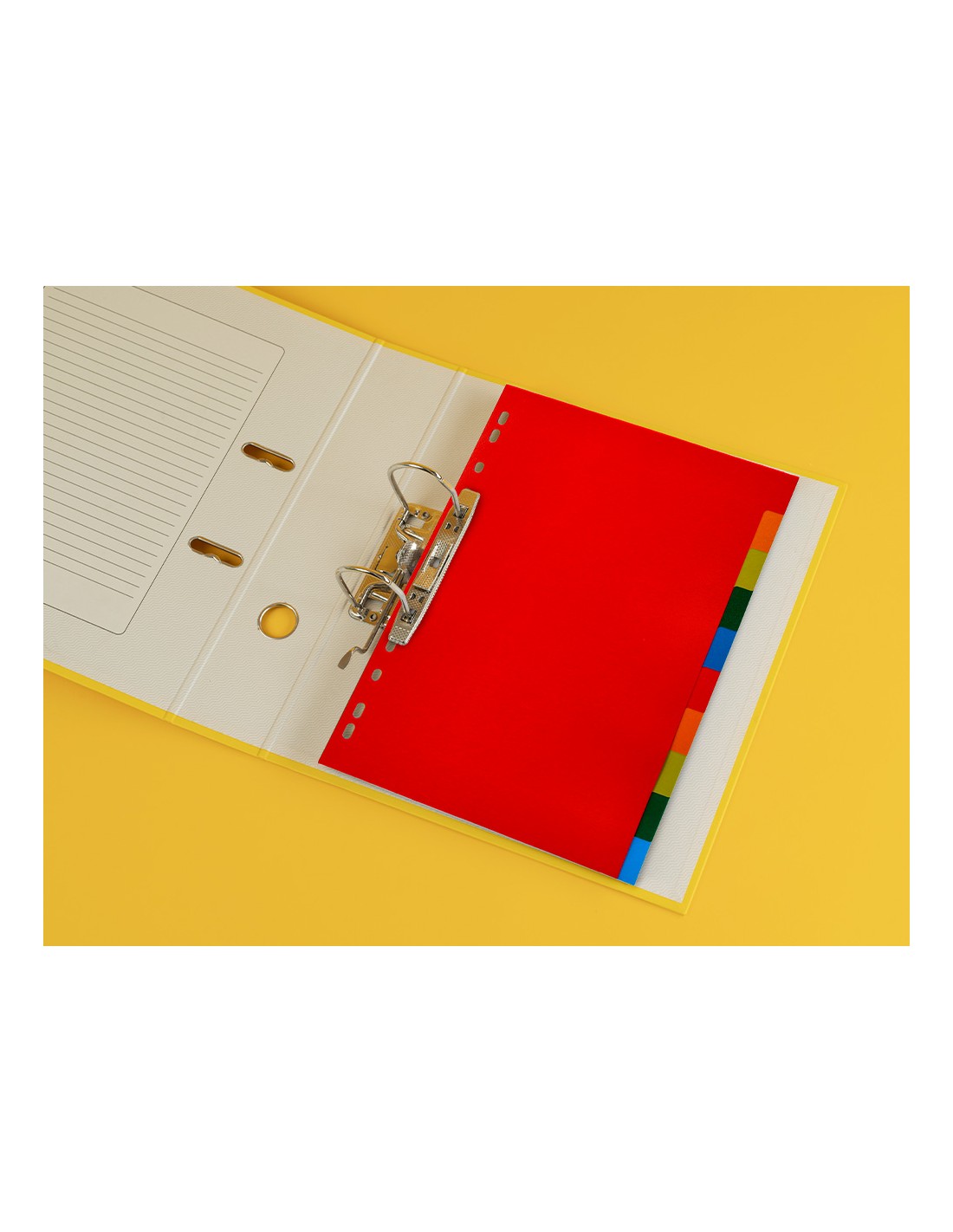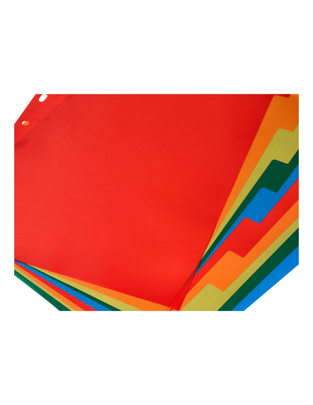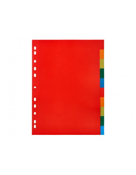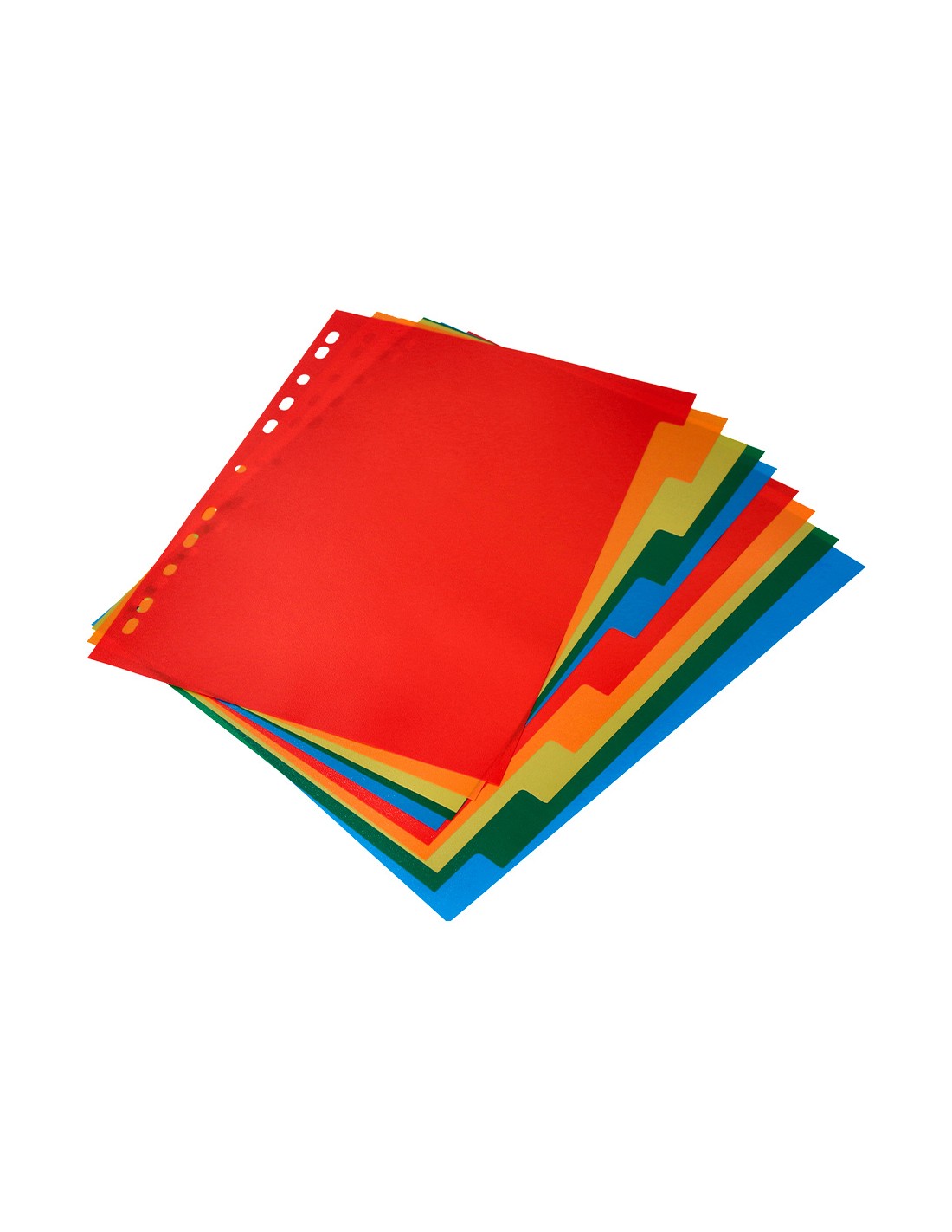 Juego de separadores fabricados en PVC de 125 micras. Colores opacos. Perforación multitaladro, para archivar en diferentes mecanismos de anillas. Incluye carátula con índice. Formato Din A4.