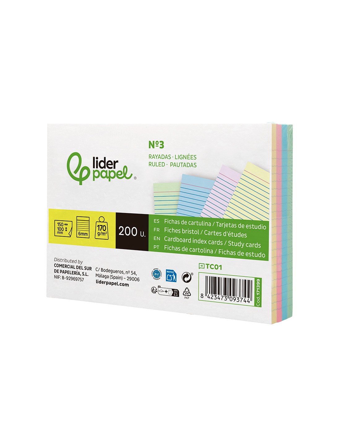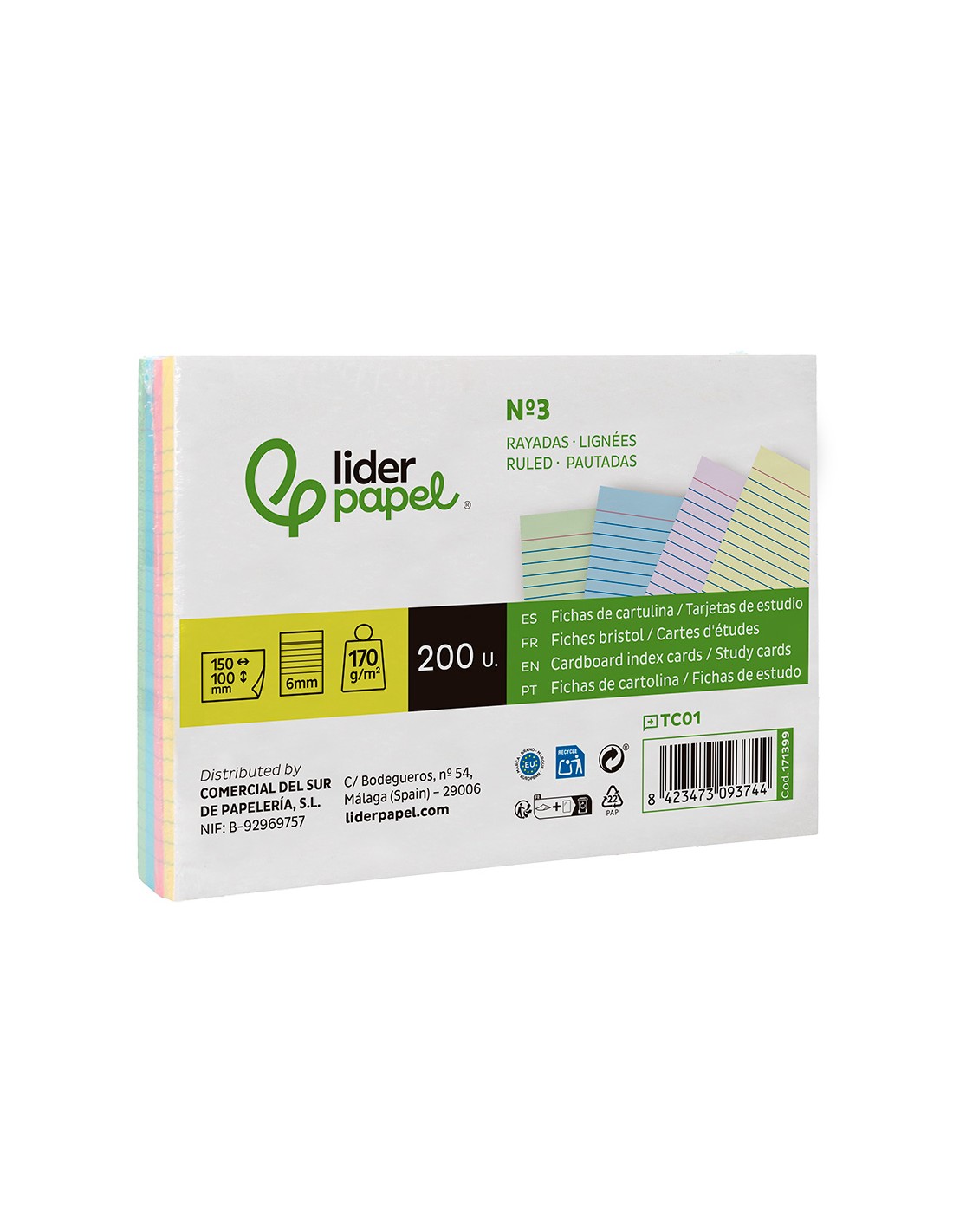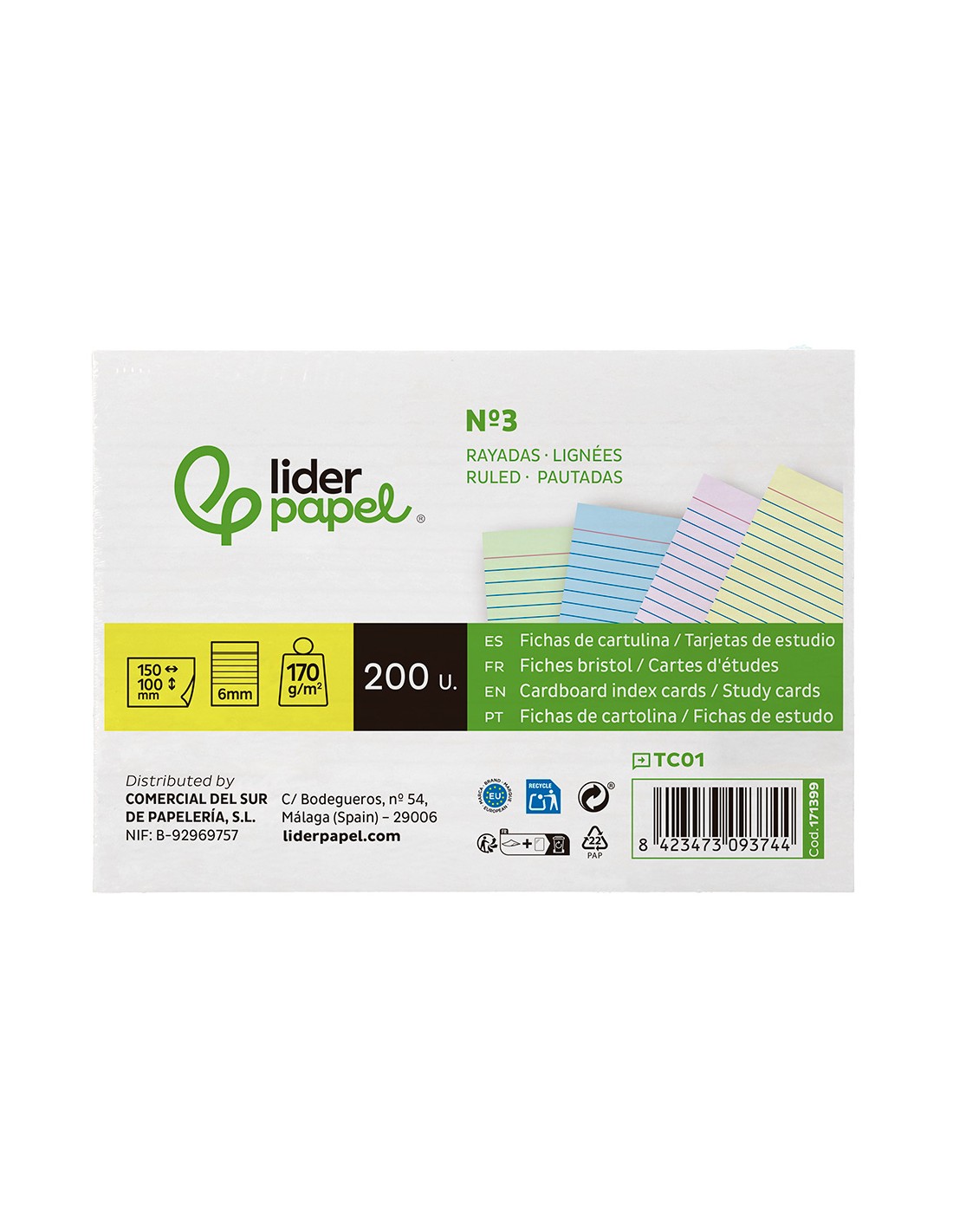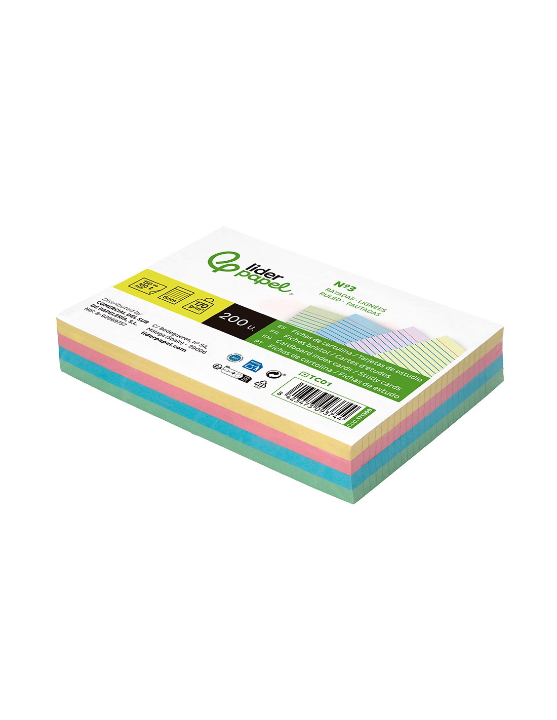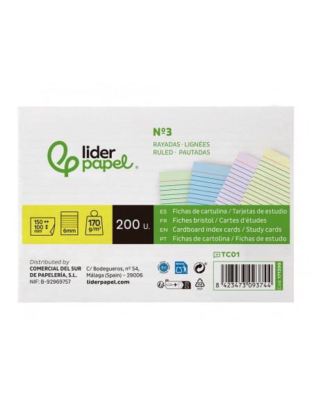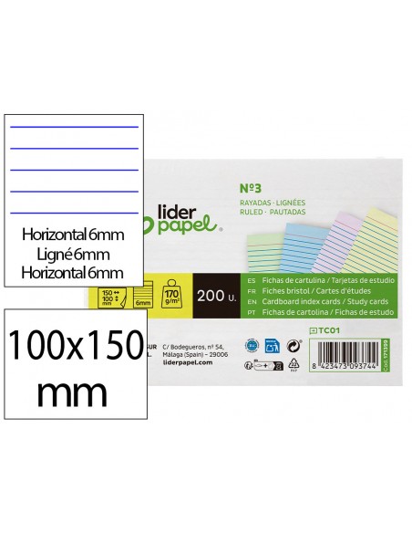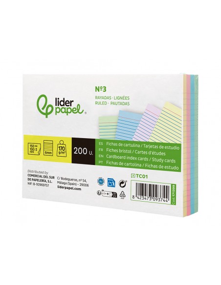 LIDERPAPELTarjeta liderpapel para estudiar rayada cartulina de colores 170 gr/m2 100x150mm paquete de 200 unidades