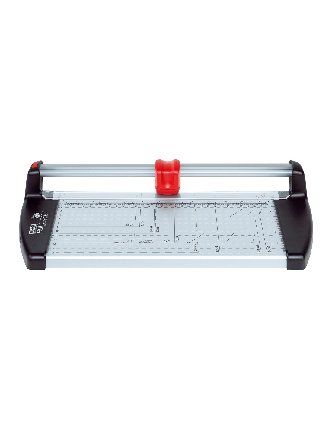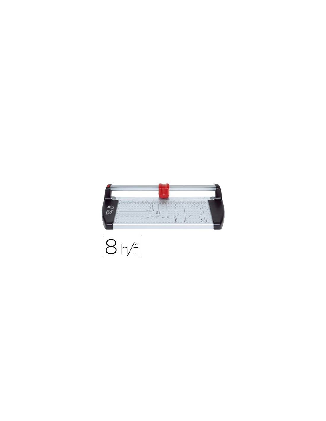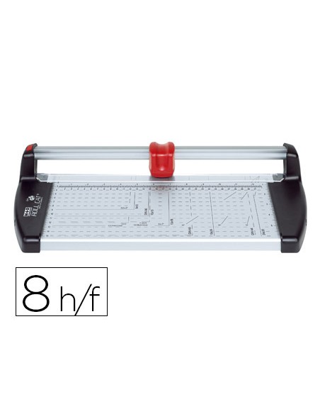 Máquina cortadora con base de aluminio. Robusta y con medidas grabadas en centímetros, pulgadas y resto de formatos habituales. Cuchilla inferior y superior (rodante) en acero templado con cabezal cortante ergonómico. Cabezal de seguridad que protege la cuchilla fácil de cambiar. Precisa y fácil de utilizar. Especialmente indicada para profesionales como diseñadores gráficos, delineantes, fotógrafos, etc. Capacidad de corte 8 hojas. Disponible en varios tamaños con diversas longitudes de corte.