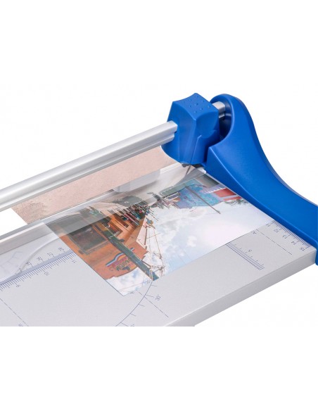 Máquina cortadora con base de aluminio. Medidas grabadas en la base con los tamaños de papel estándar. Perfecta para la oficina doméstica o para escritorio. Cuchilla rodante con carcasa de plástico para una mayor seguridad. Es ideal para cortes precisos y limpios de papel, cartón y fotografías.