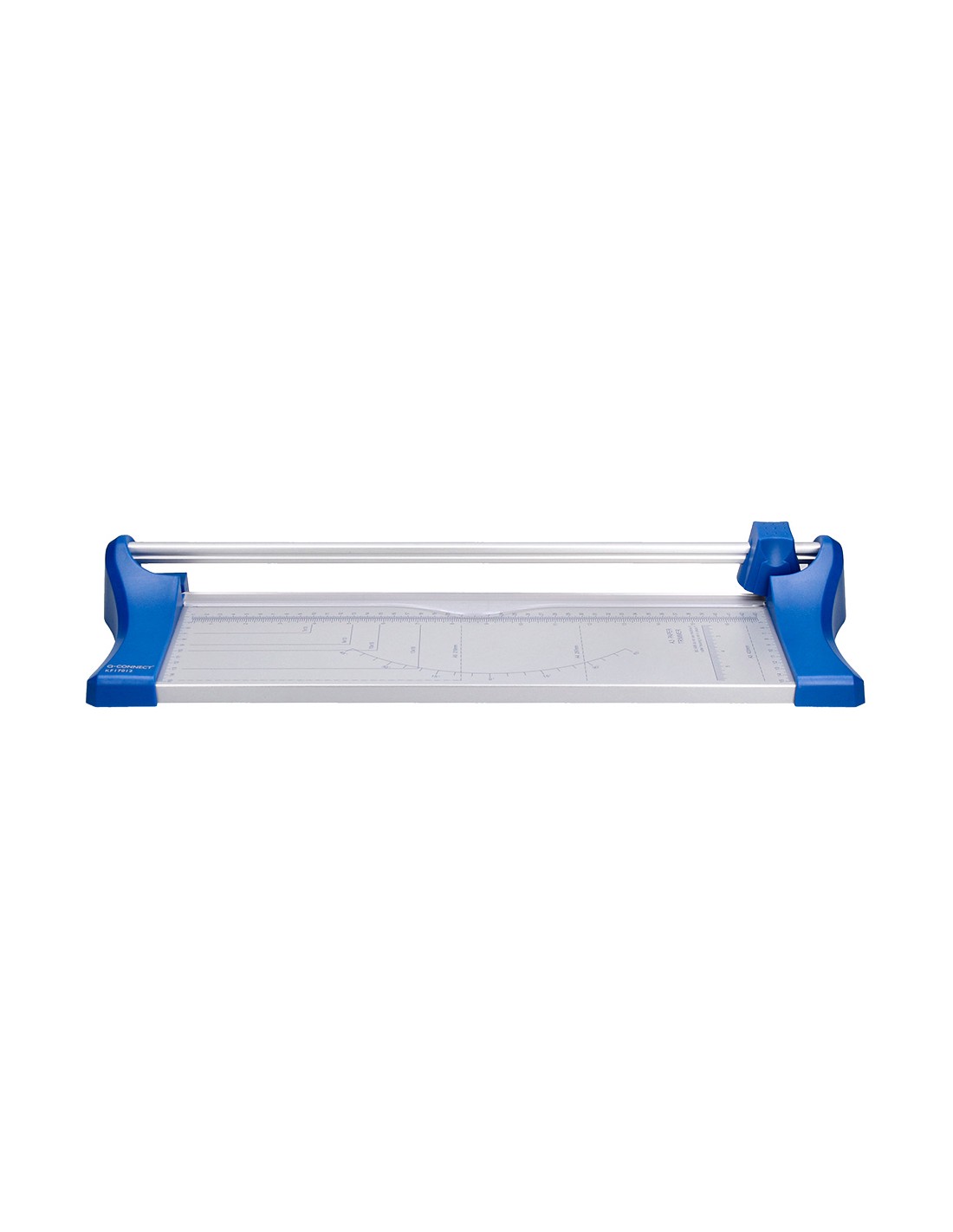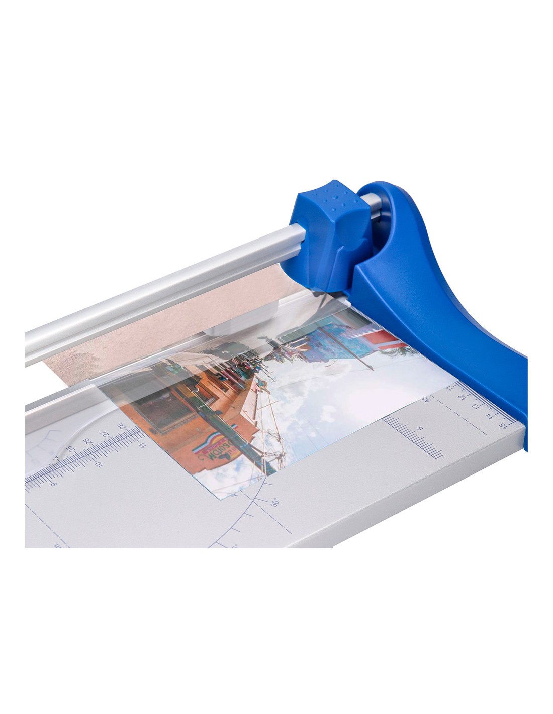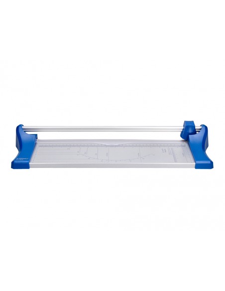 Máquina cortadora con base de aluminio. Medidas grabadas en la base con los tamaños de papel estándar. Perfecta para la oficina doméstica o para escritorio. Cuchilla rodante con carcasa de plástico para una mayor seguridad. Es ideal para cortes precisos y limpios de papel, cartón y fotografías.