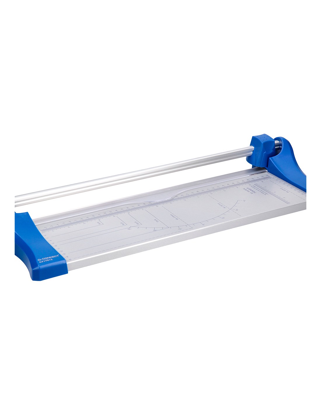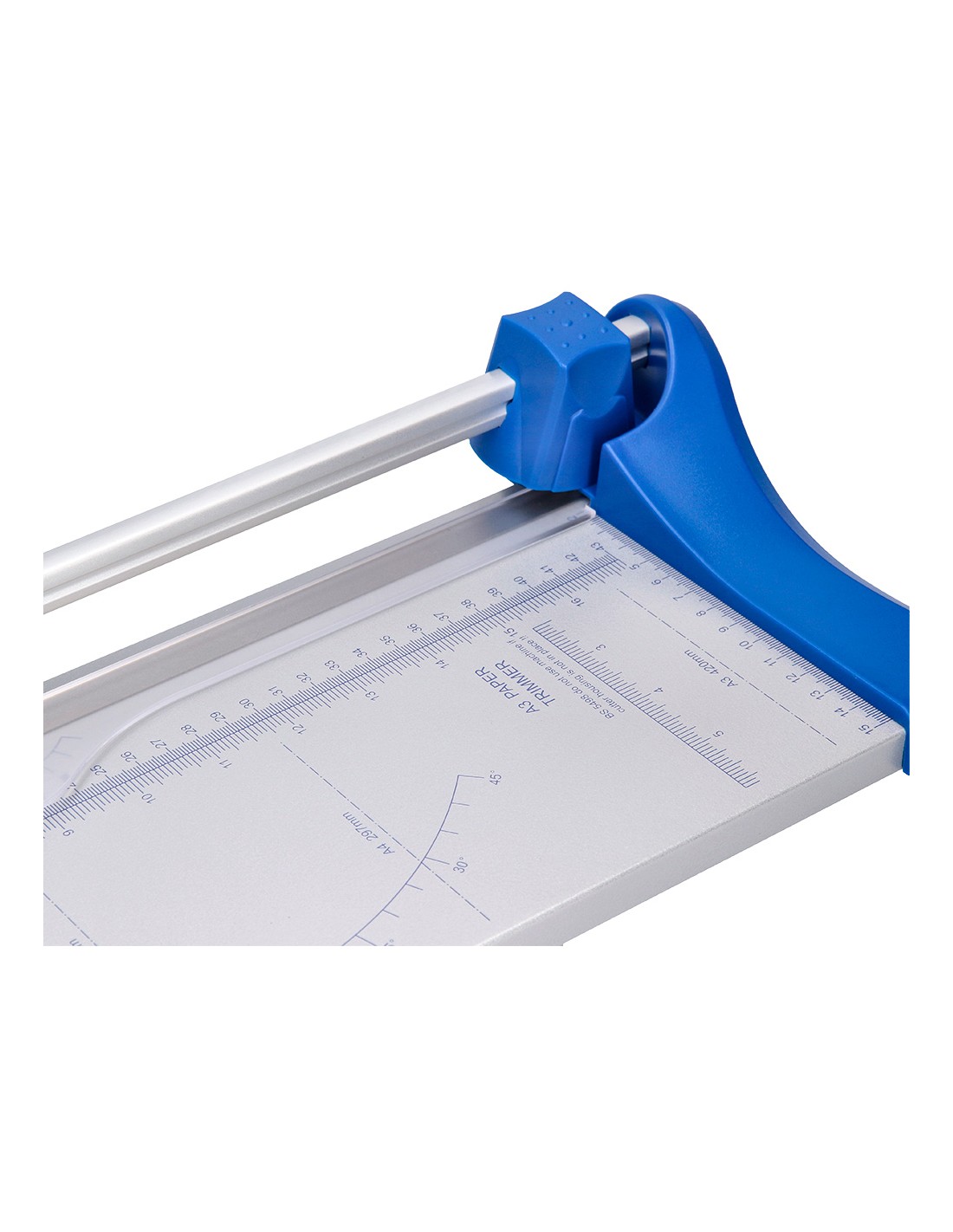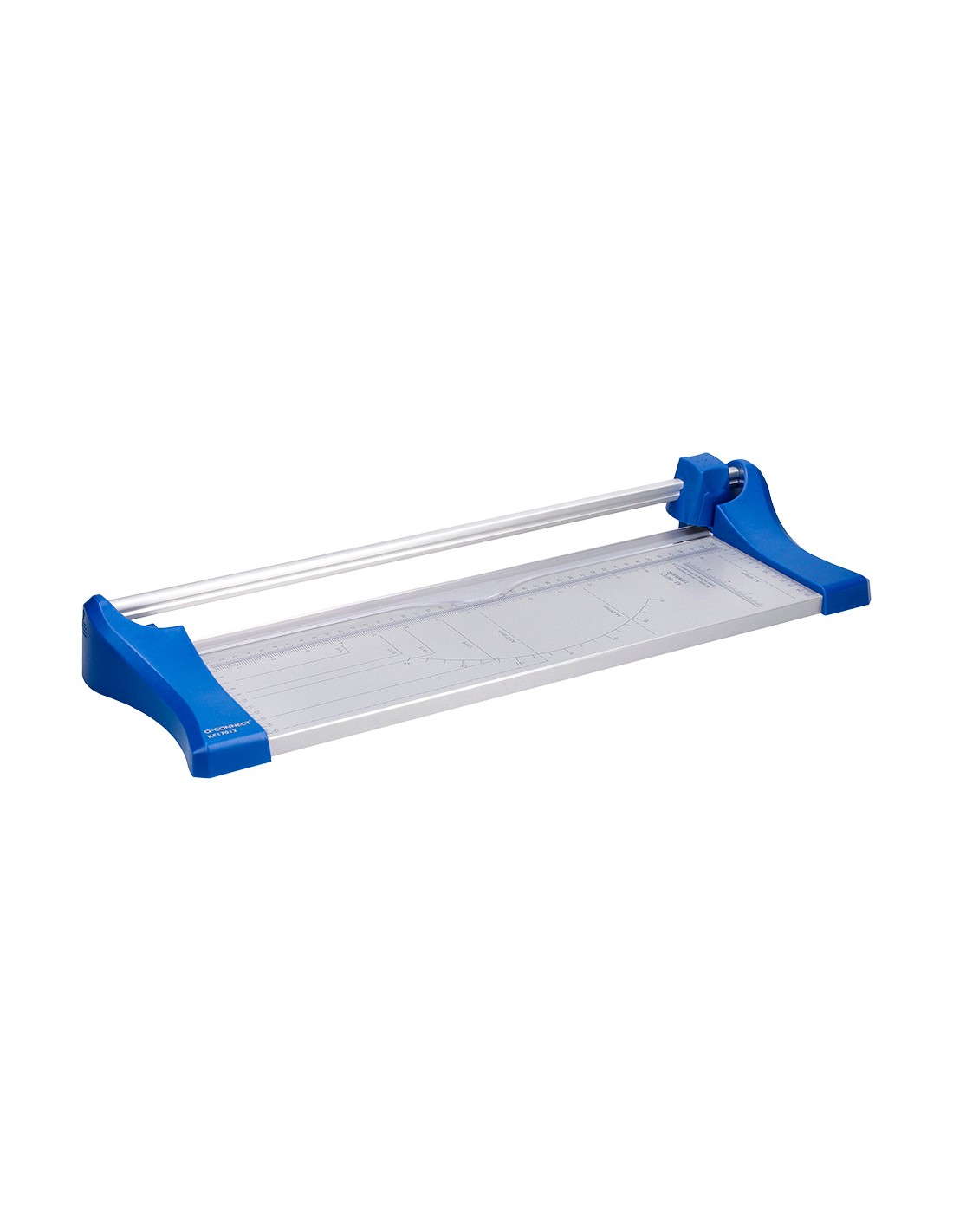 Máquina cortadora con base de aluminio. Medidas grabadas en la base con los tamaños de papel estándar. Perfecta para la oficina doméstica o para escritorio. Cuchilla rodante con carcasa de plástico para una mayor seguridad. Es ideal para cortes precisos y limpios de papel, cartón y fotografías.