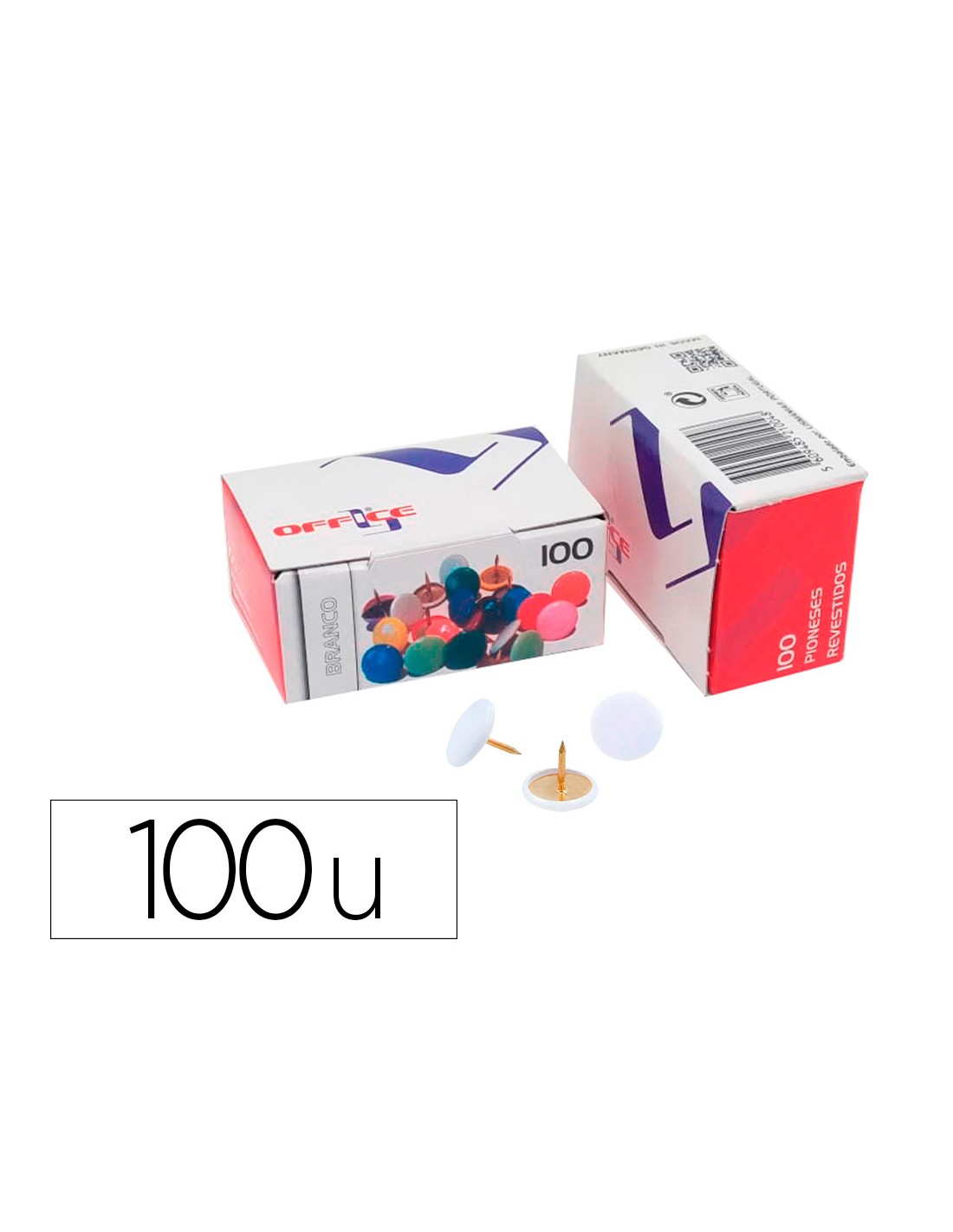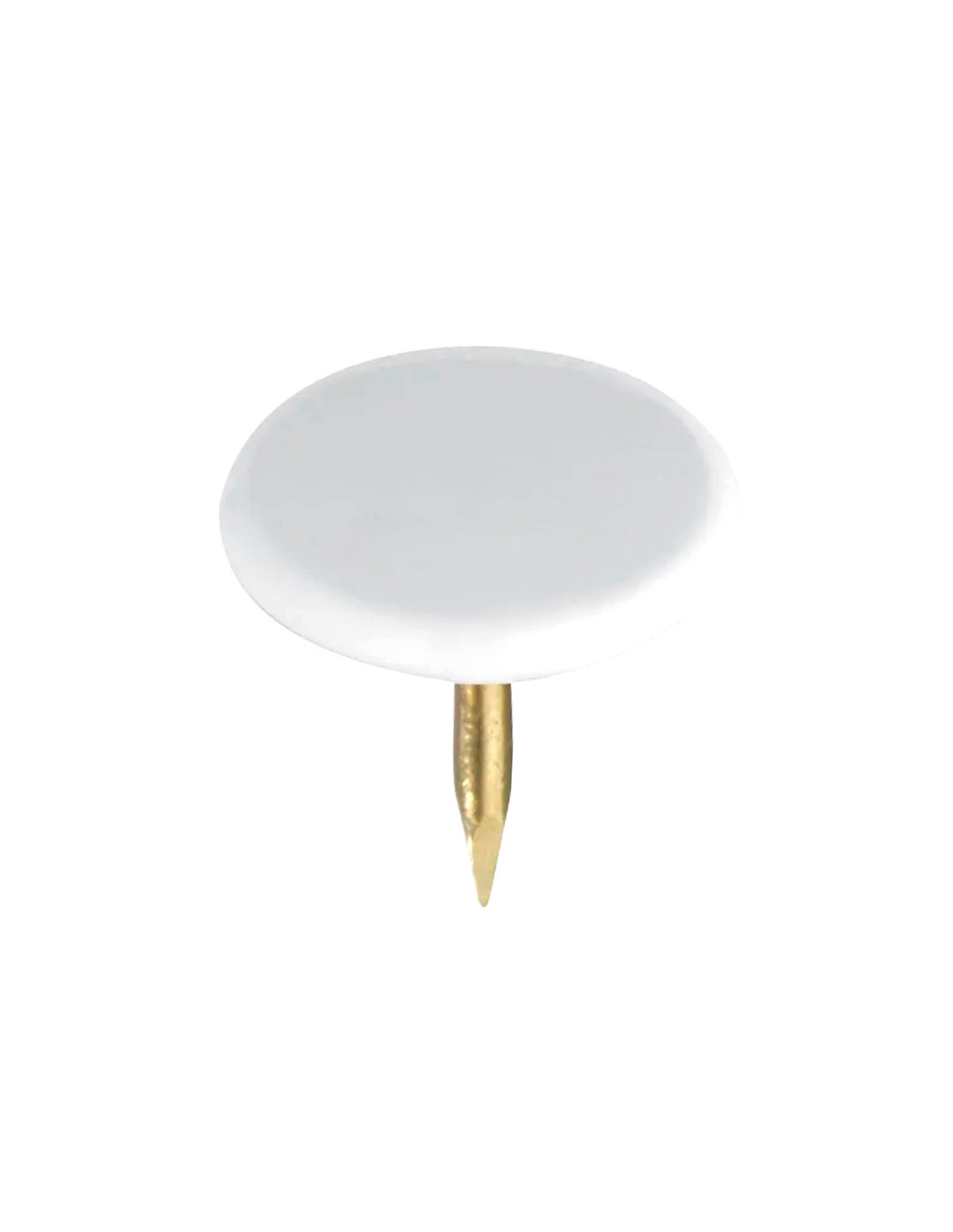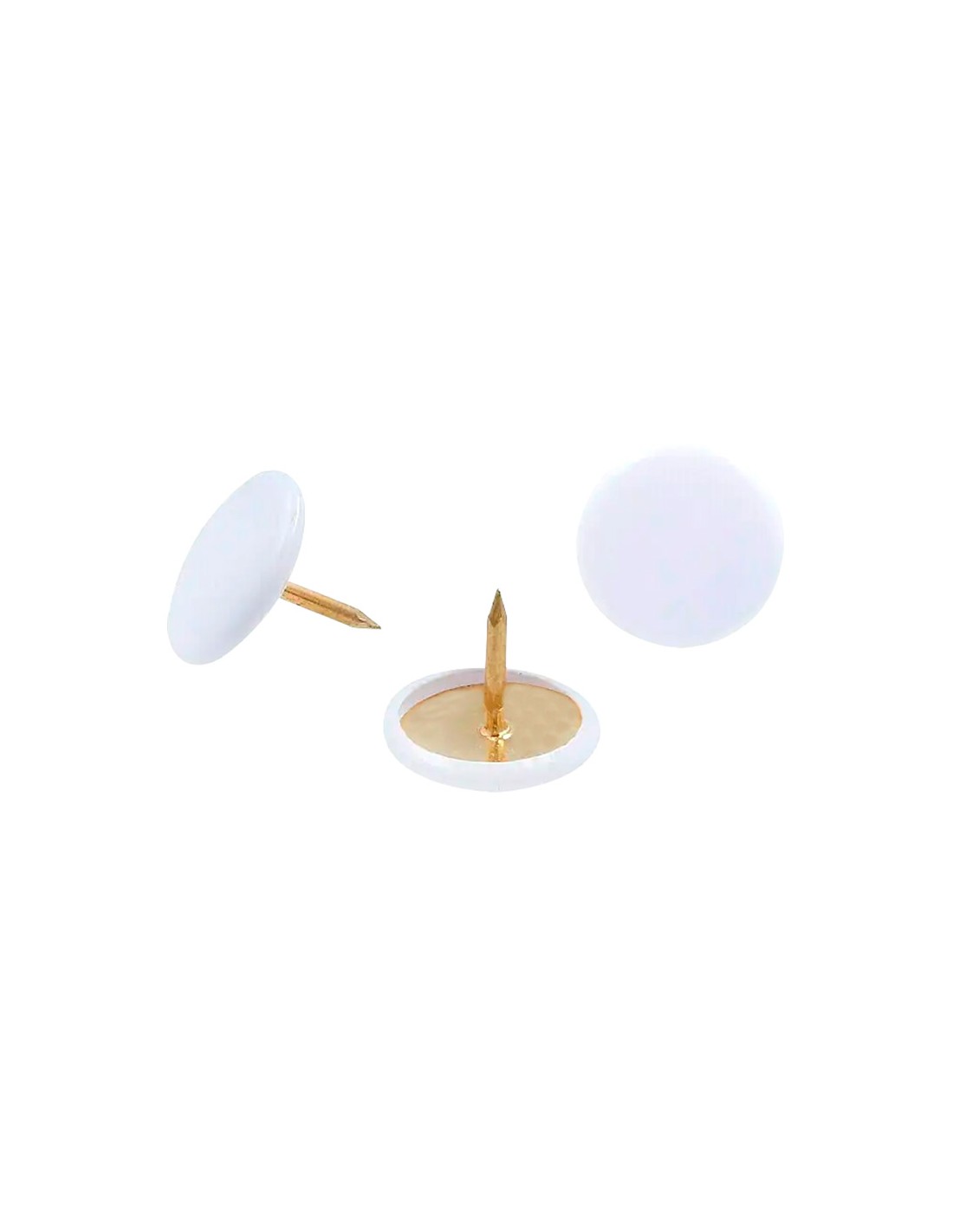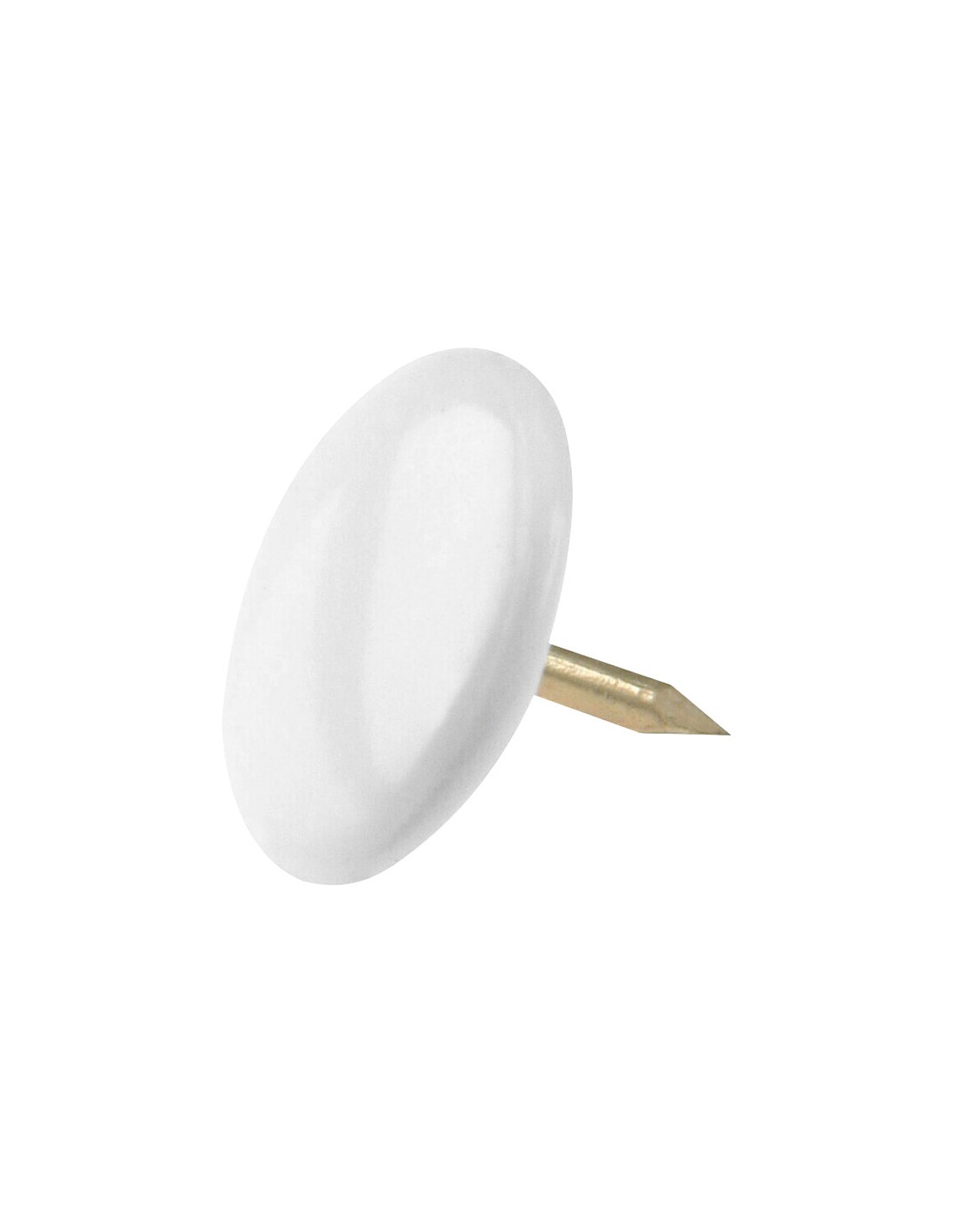 Chinchetas recubiertas de plástico con cabeza plana. Diámetro de la cabeza 9 mm. Longitud 8 mm. Color blanco. Caja de 100 unidades.