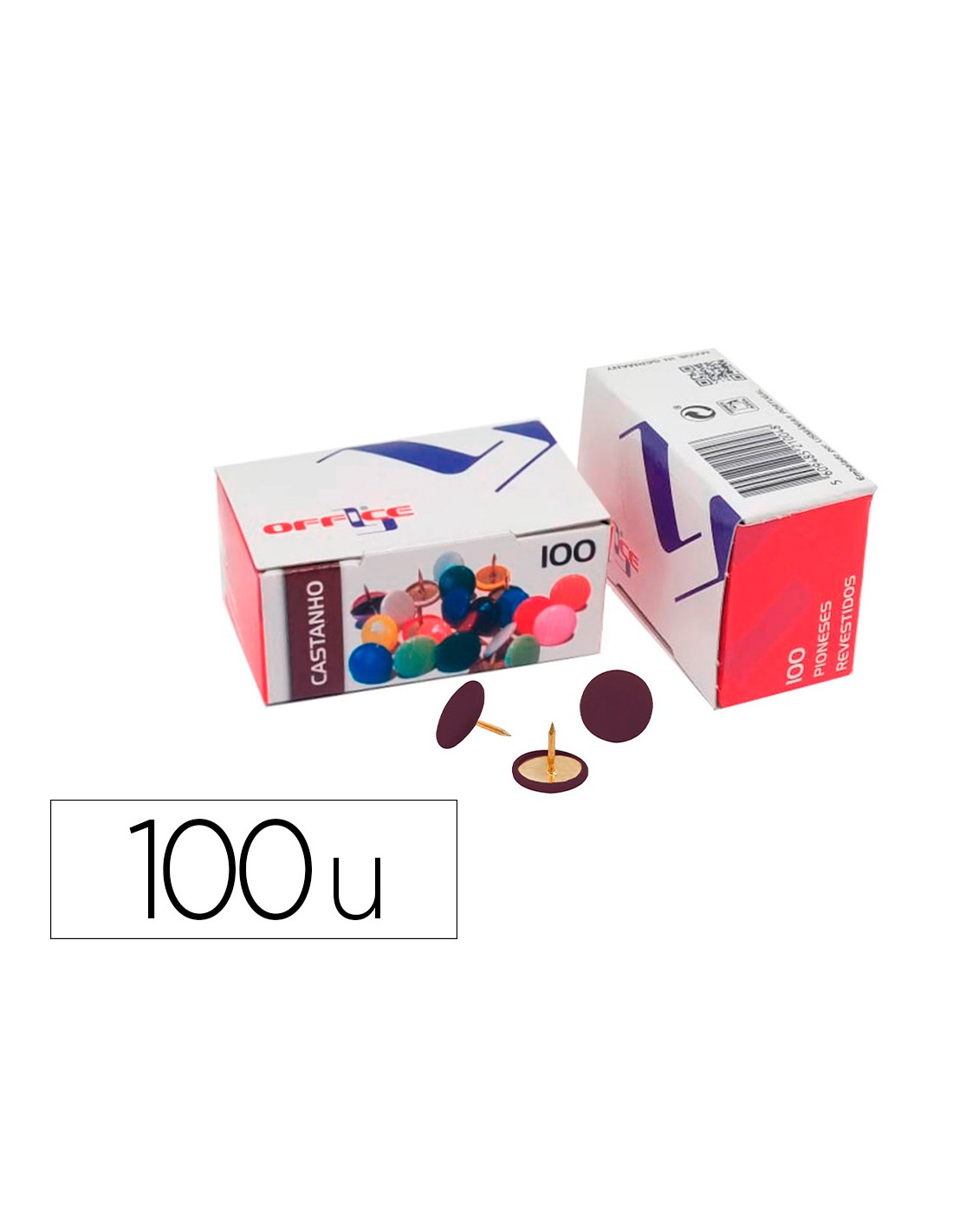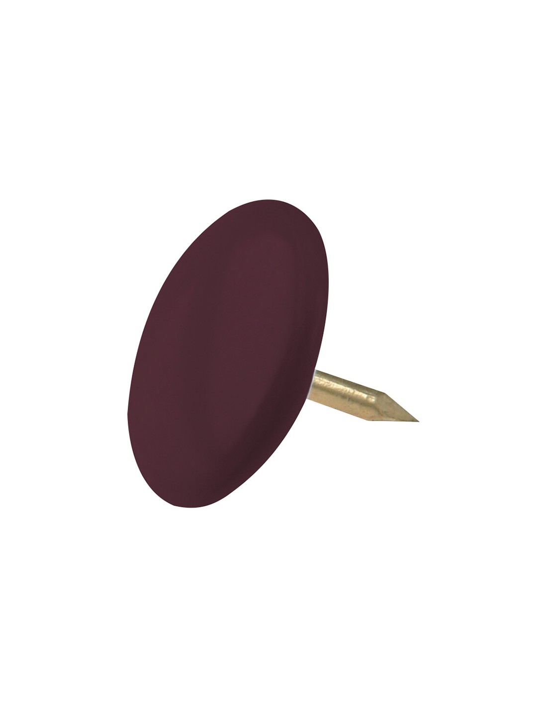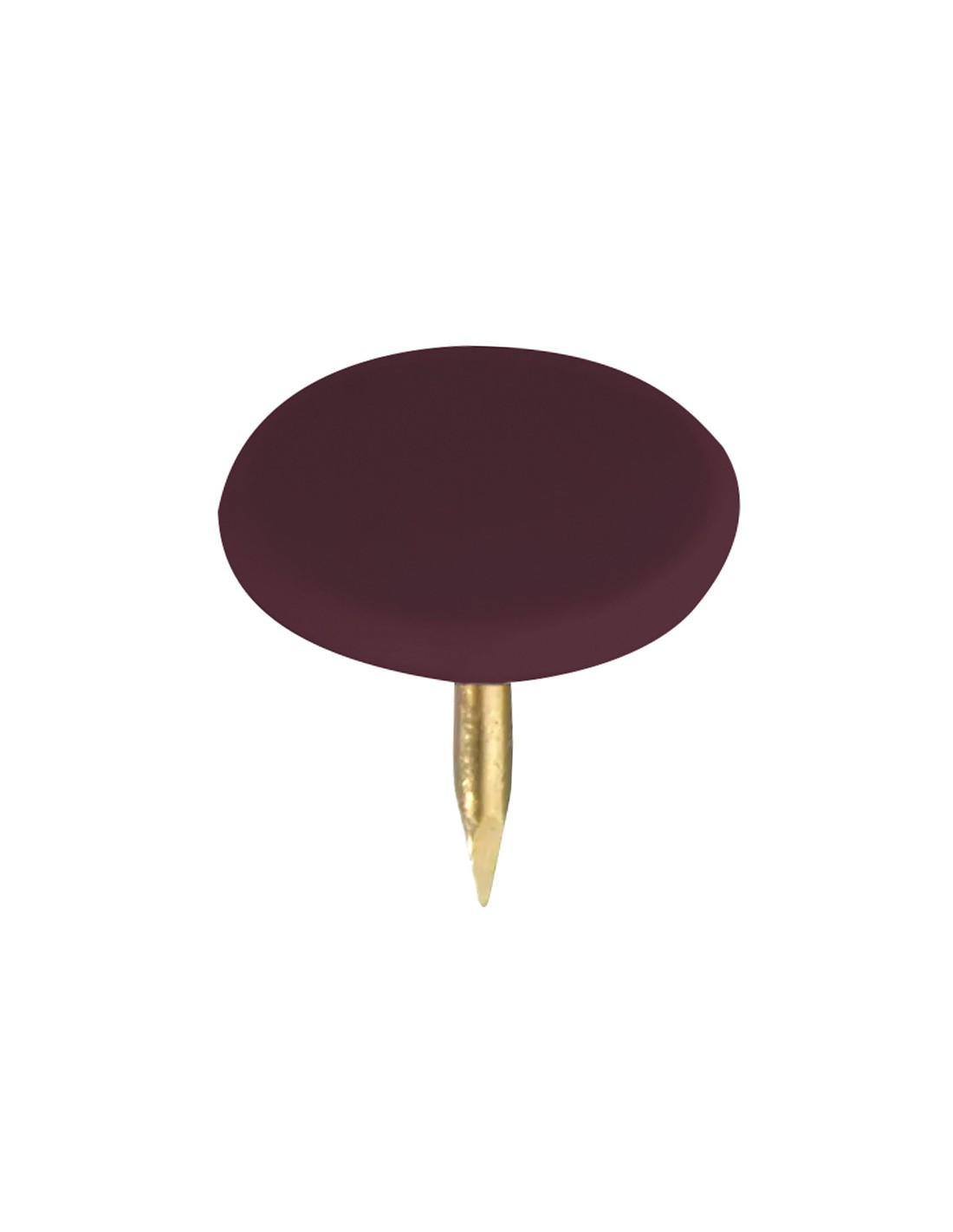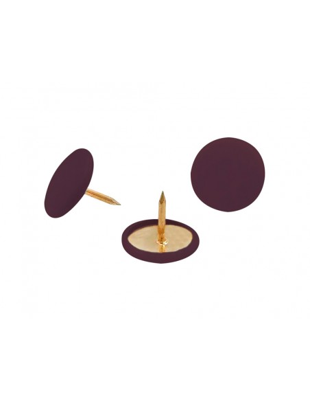 Chinchetas recubiertas de plástico con cabeza plana. Diámetro de la cabeza 9 mm. Longitud 8 mm. Color marrón. Caja de 100 unidades.