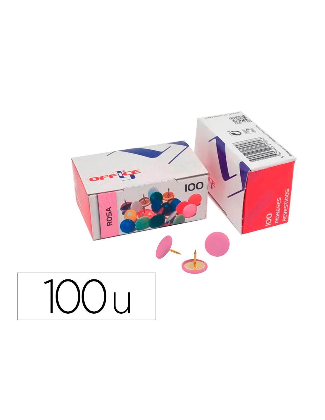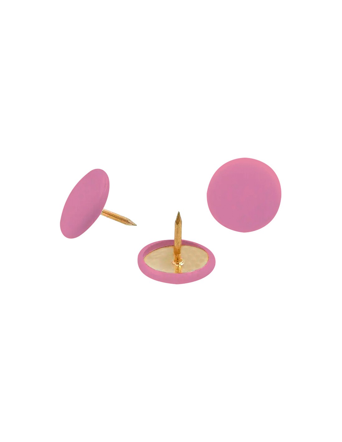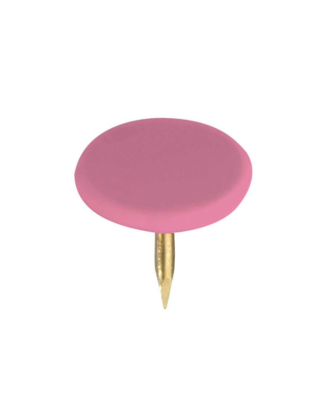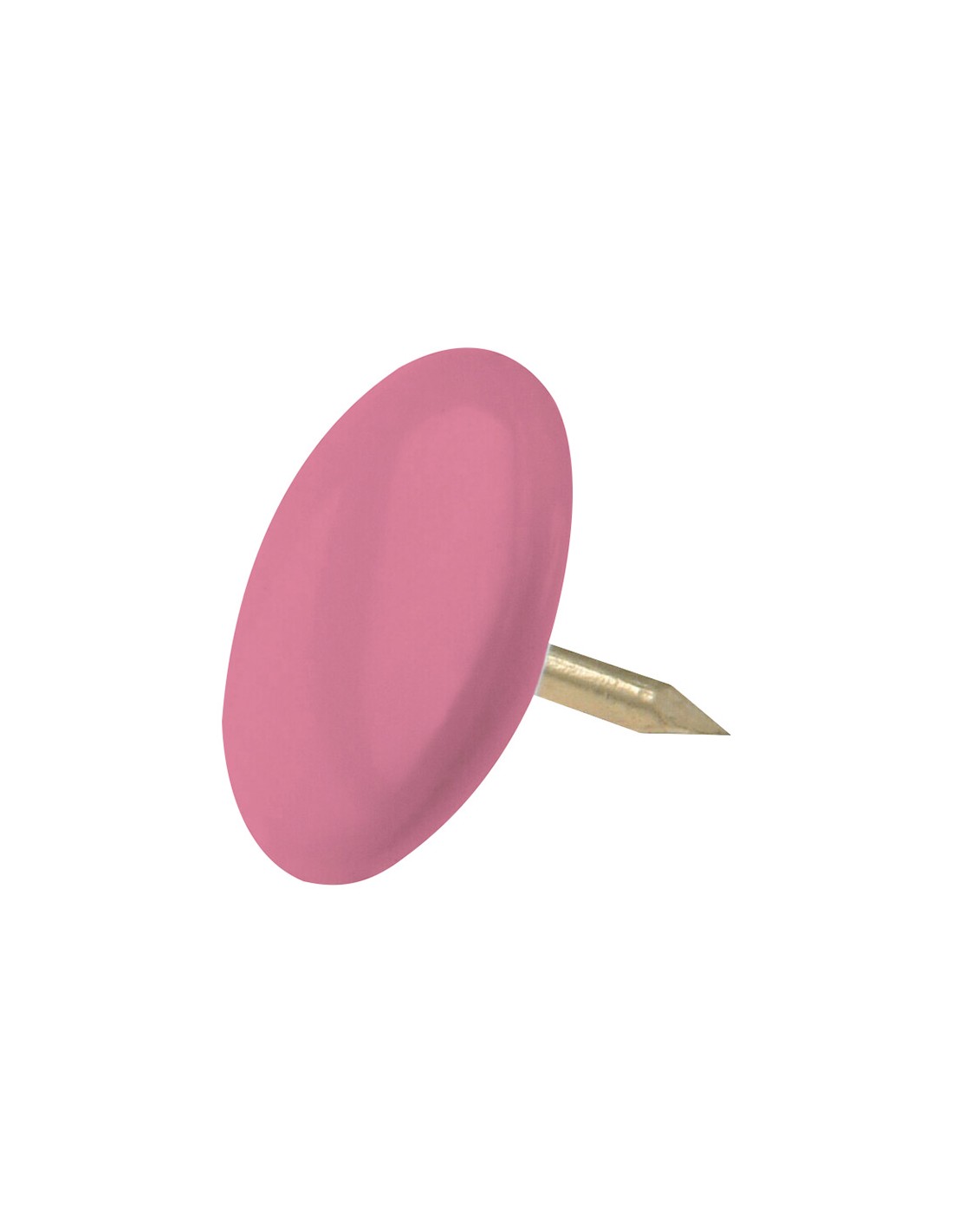 Chinchetas recubiertas de plástico con cabeza plana. Diámetro de la cabeza 9 mm. Longitud 8 mm. Color rosa. Caja de 100 unidades.