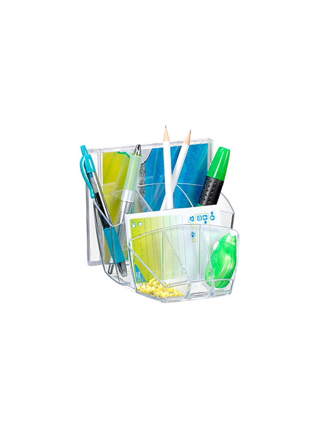 Fabricado en poliestireno. 7 departamentos para alojar una amplia variedad de pasadores, clips, lápices, plumas y otros artículos de oficina. Más del 90% de material reciclado. No incluye accesorios. Medidas 150 x 120 x 92 mm.