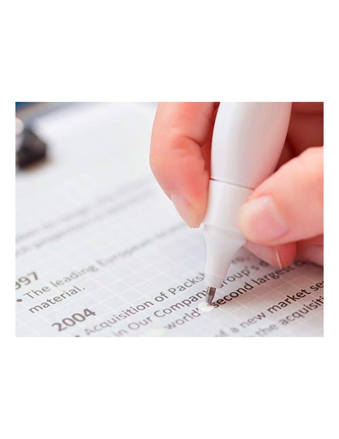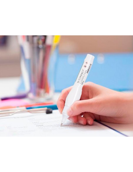 Corrector lápiz roller de punta metálica. Se desliza suavemente. No se seca. Control del flujo de líquido presionando en el grip. Contenido 8 ml.