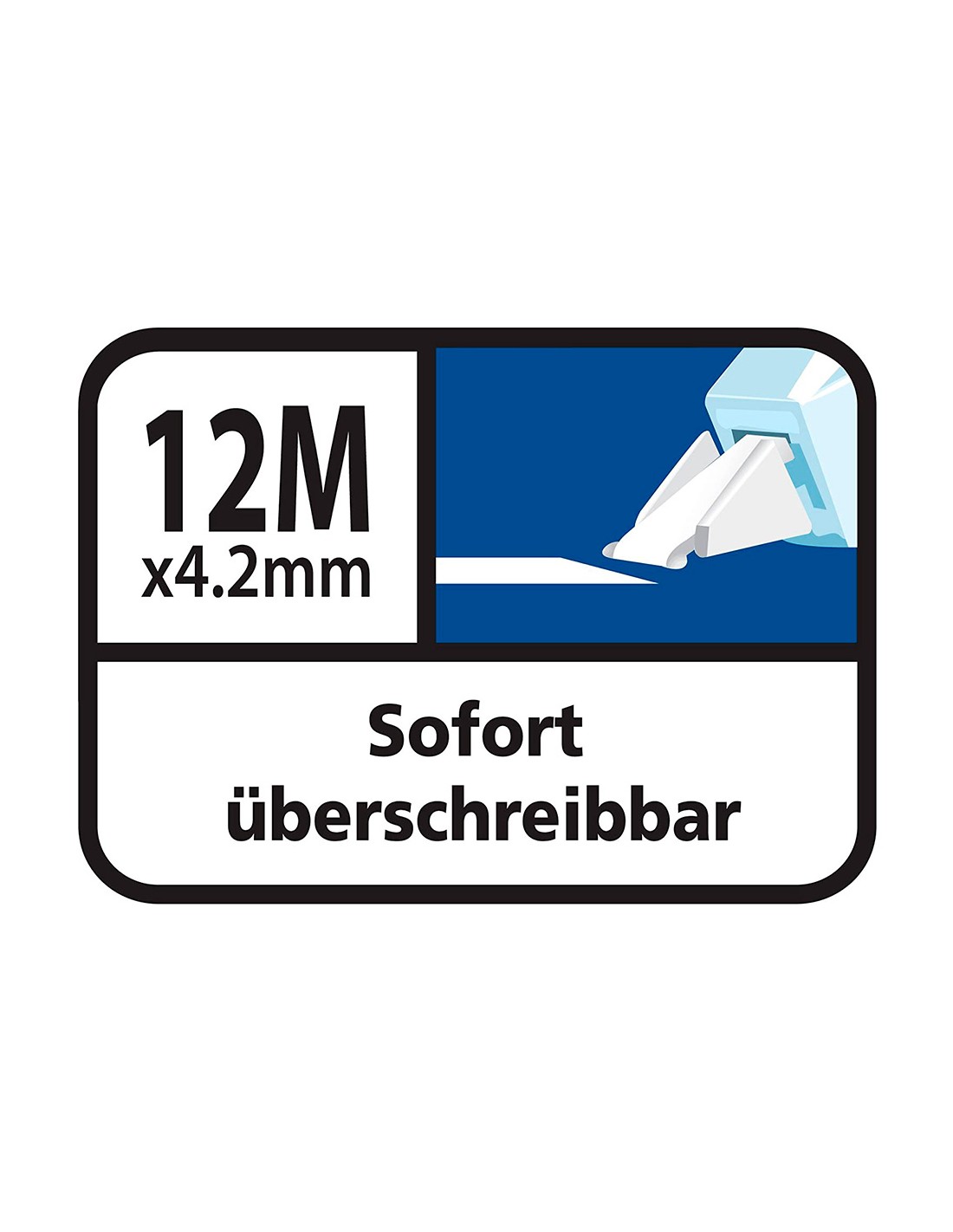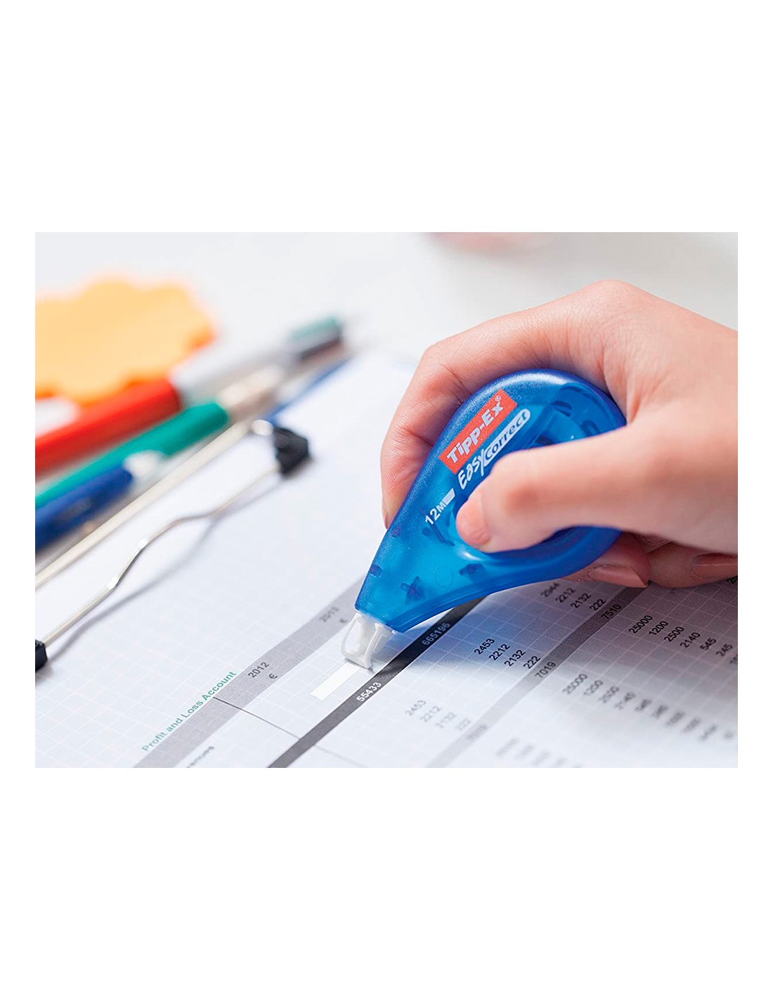 Cinta correctora en seco. Cuerpo translúcido azul, diseño divertido. Reescritura rápida y cómoda. Ideal para todo tipo de papel. Invisible al fotocopiar. Muy fácil de aplicar. Corrección lateral. Ancho de la cinta 4,2 mm. Largo 12 m.