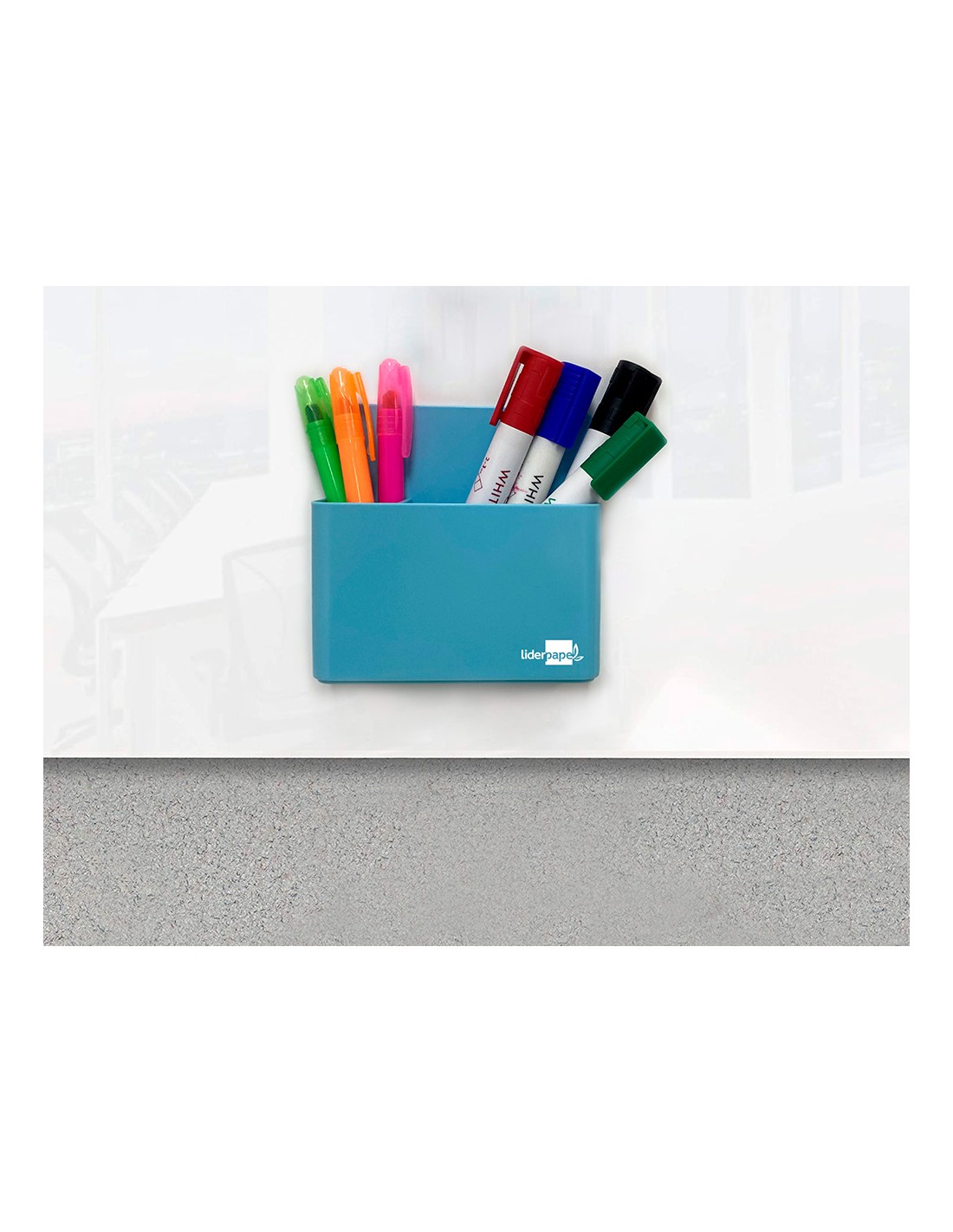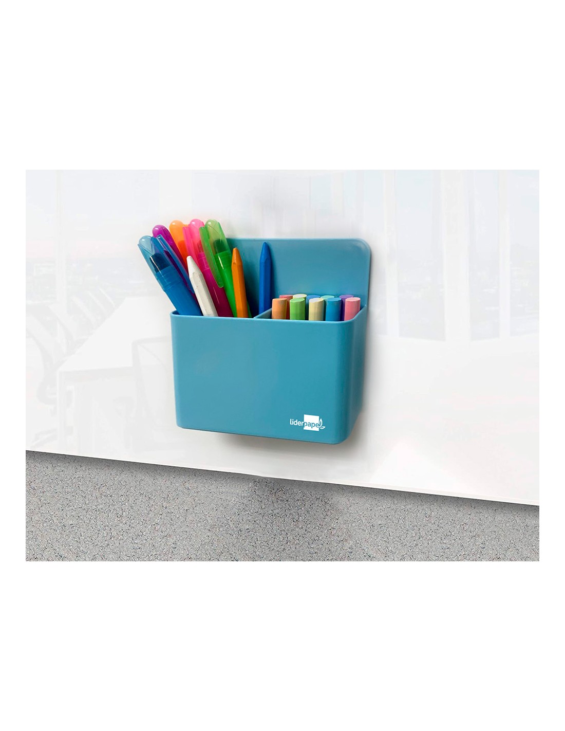 Cubilete magnético con imán muy potente, para superficies de metal como pizarras blancas o armarios. 100% reciclable. 2 compartimentos móviles para mantener elementos rectos. Medidas interiores 125 x 75 x 40 mm.