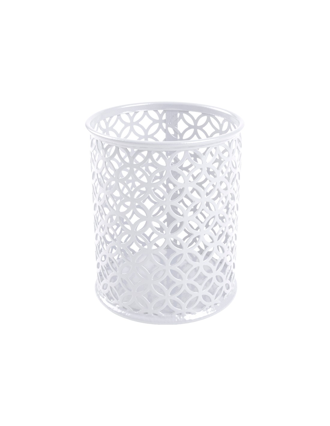 Cubilete redondo de metal con diseño de rejilla en círculos. Perfecto para alojar lápices, rotuladores, bolígrafos. No incluye accesorios. Medidas Ø 80 x 100 mm.