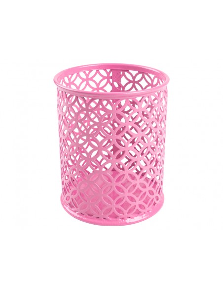 Cubilete redondo de metal con diseño de rejilla en círculos. Perfecto para alojar lápices, rotuladores, bolígrafos. No incluye accesorios. Medidas Ø 80 x 100 mm.