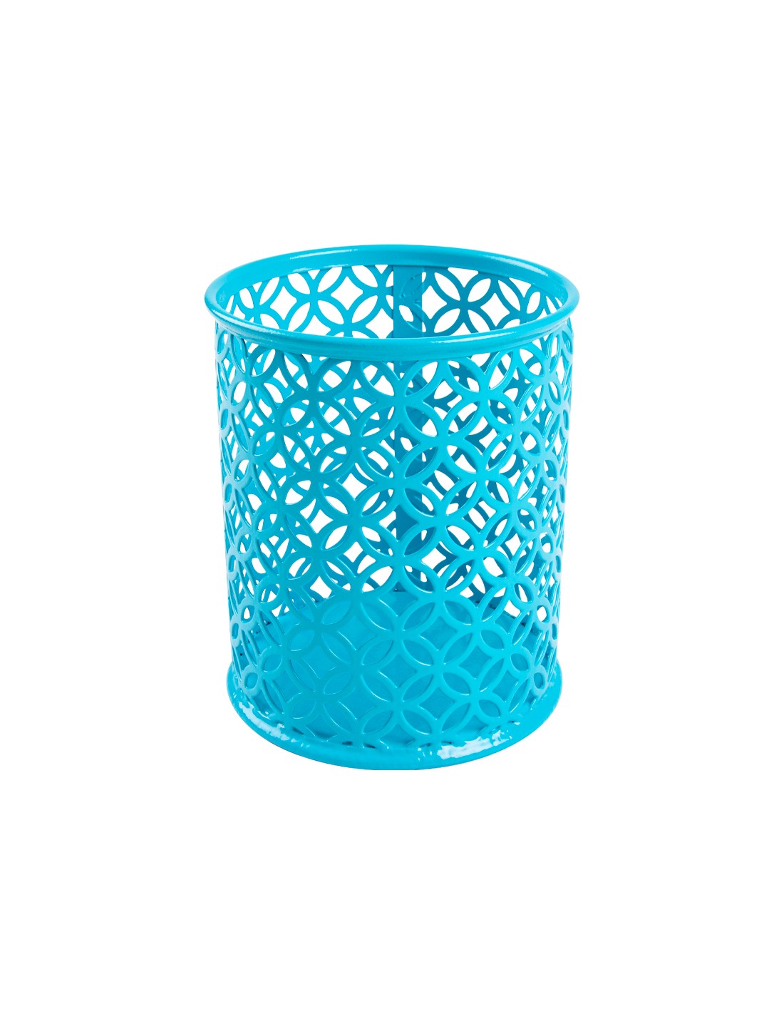 Cubilete redondo de metal con diseño de rejilla en círculos. Perfecto para alojar lápices, rotuladores, bolígrafos. No incluye accesorios. Medidas Ø 80 x 100 mm.