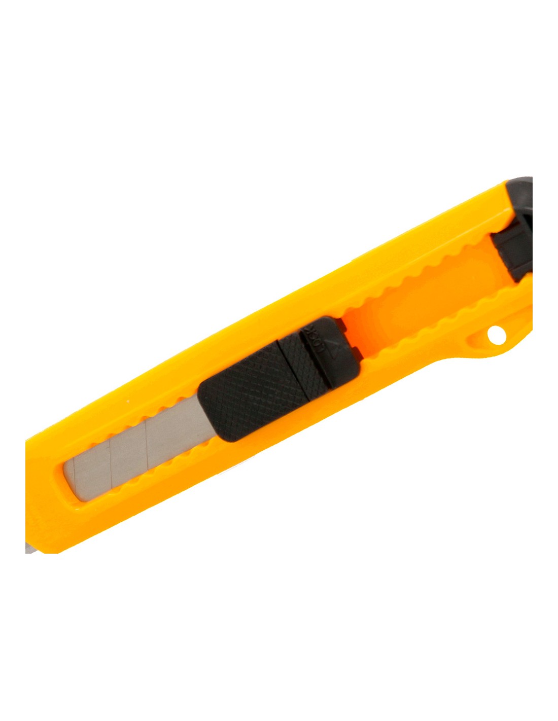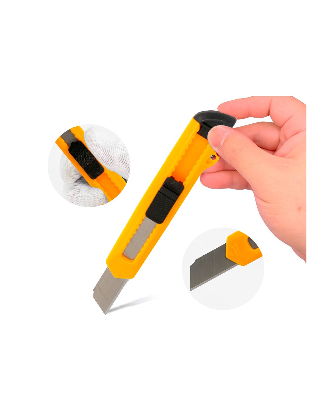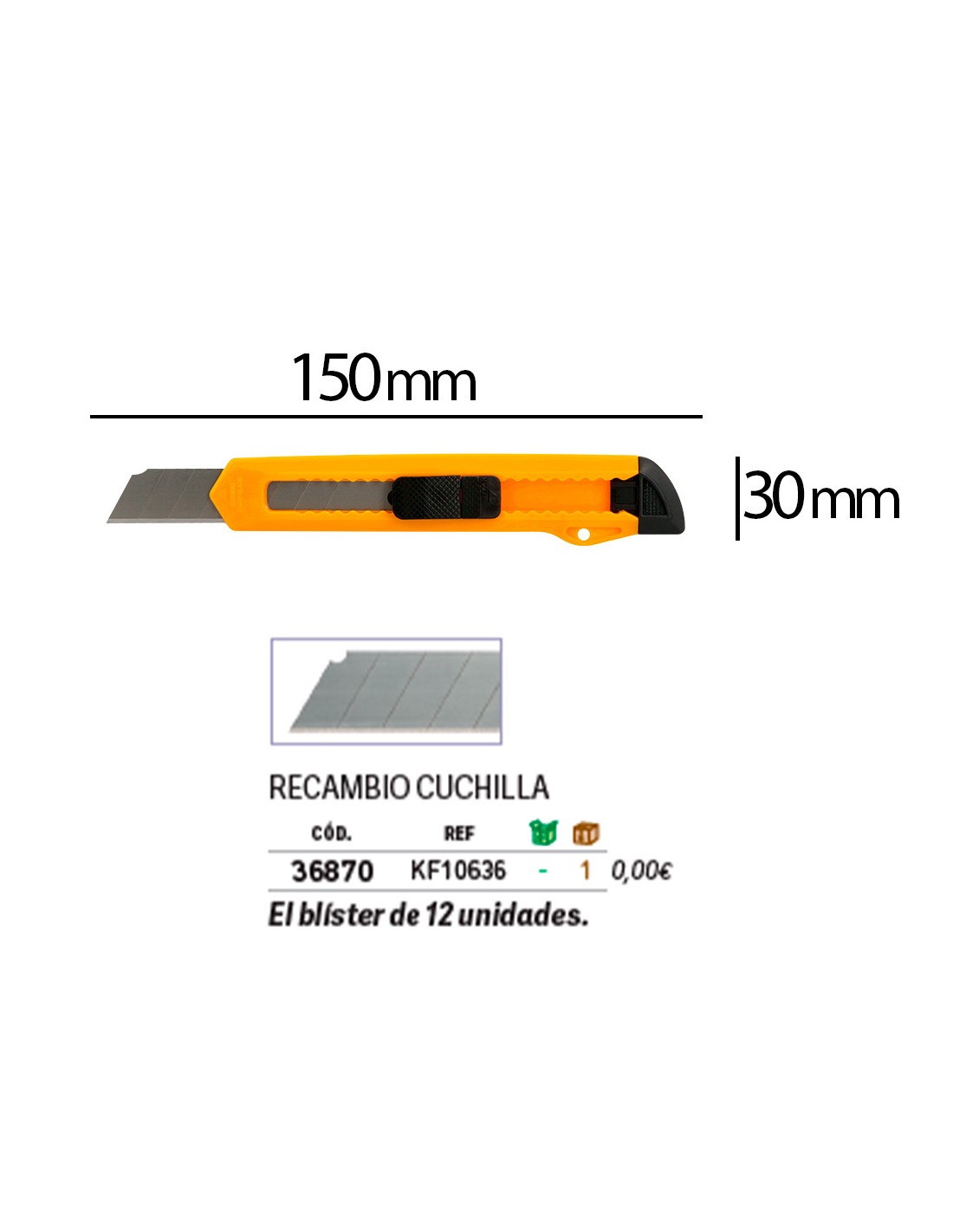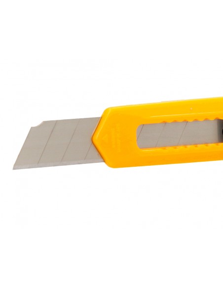 Retráctil e intercambiable. Cuchilla de acero precortado y freno de seguridad. Cuchilla de 18 mm de ancho. Longitud 150 mm. El blíster de 1 unidad.