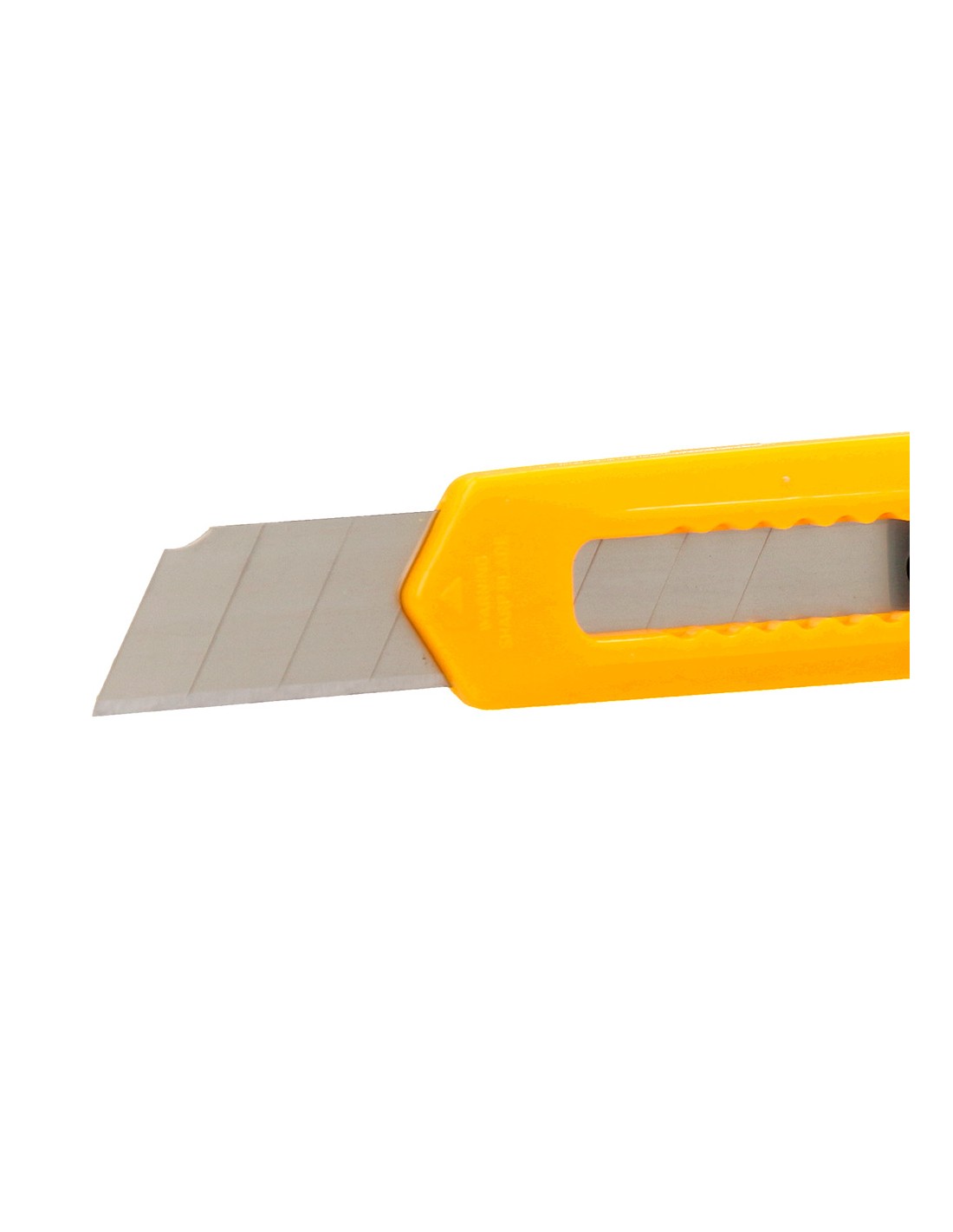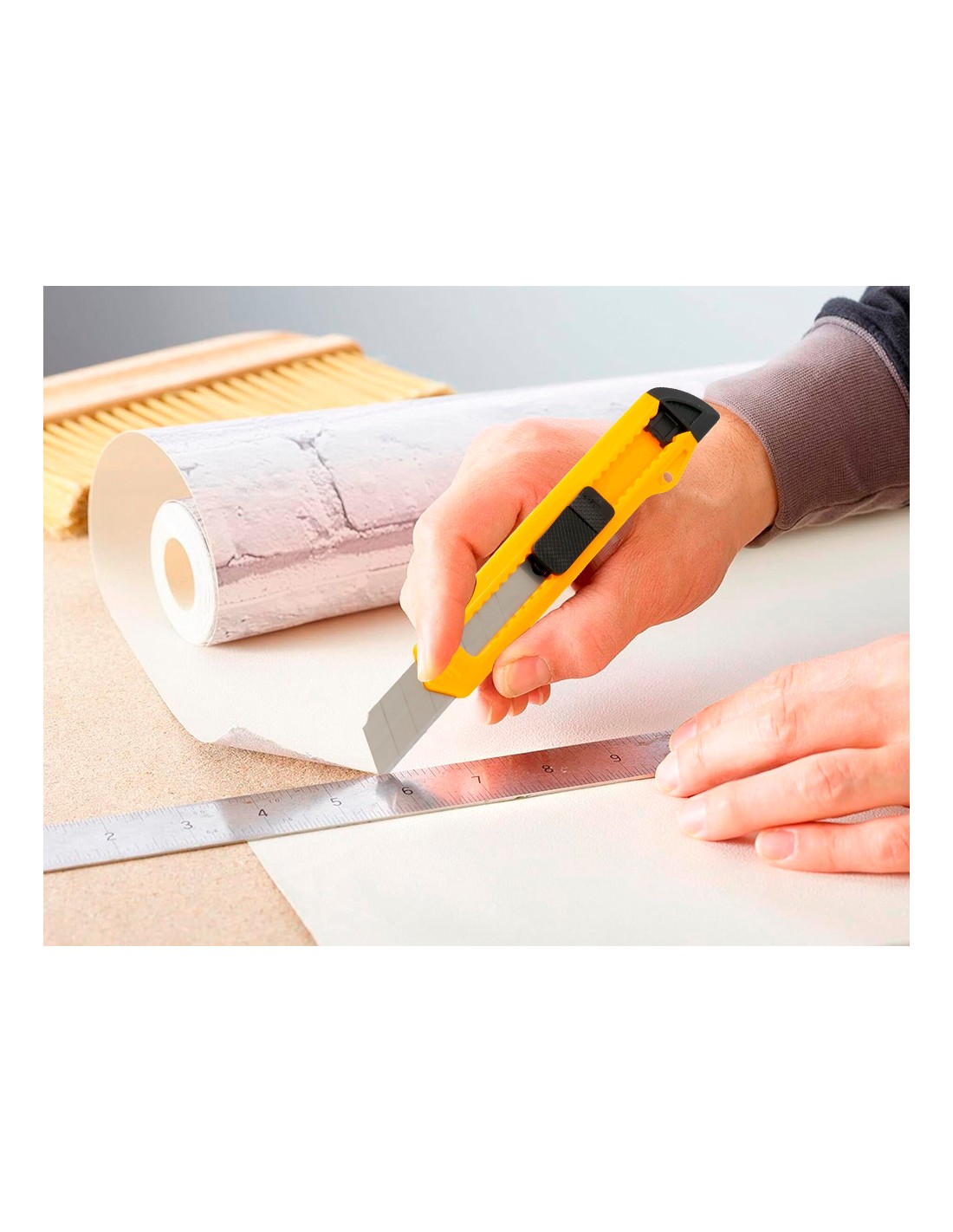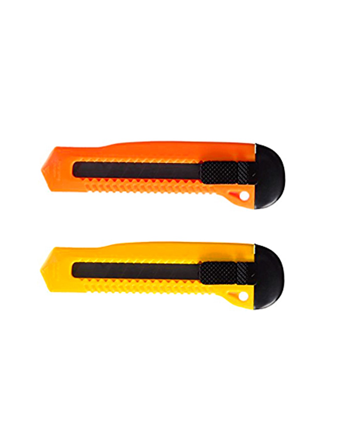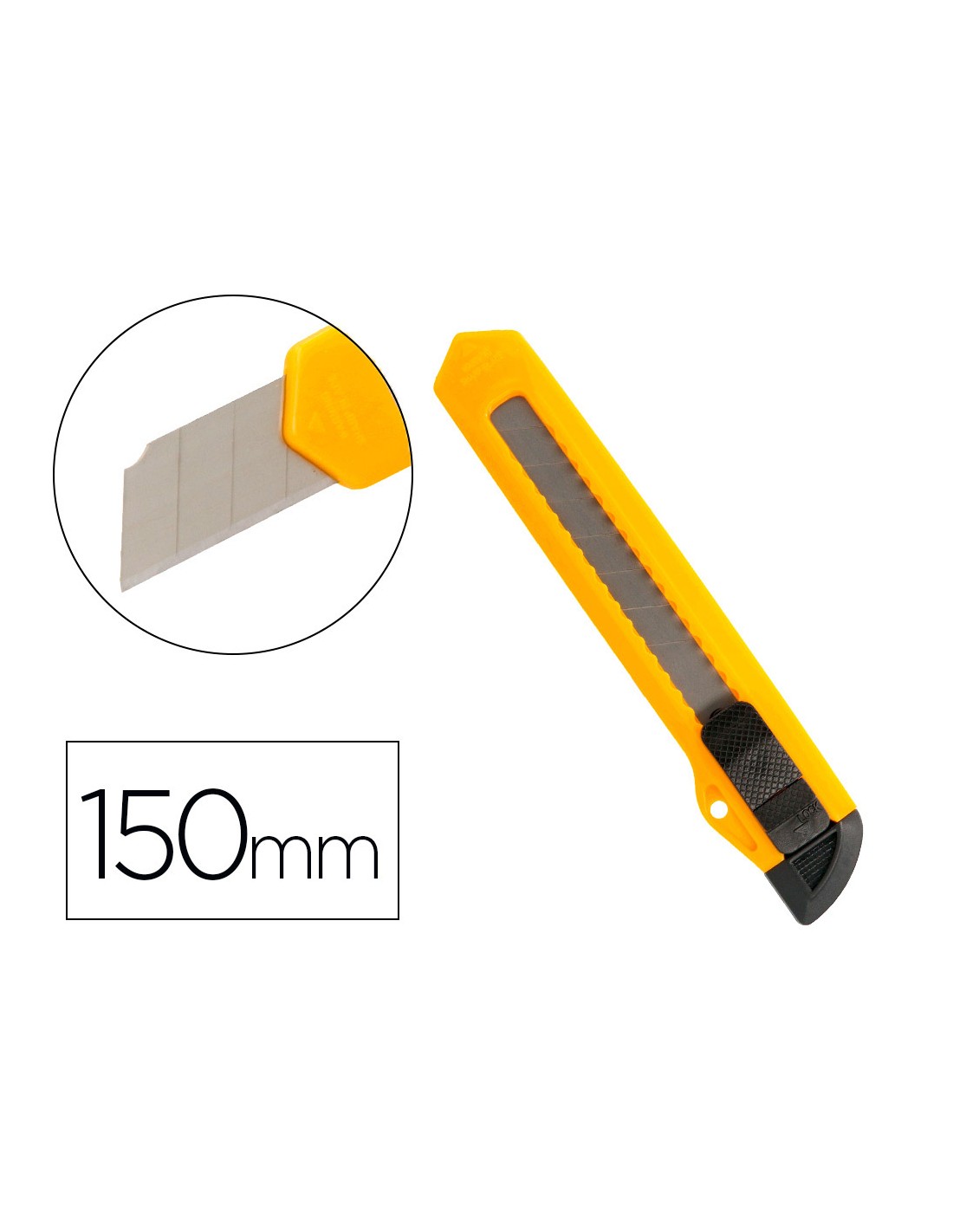 Retráctil e intercambiable. Cuchilla de acero precortado y freno de seguridad. Cuchilla de 18 mm de ancho. Longitud 150 mm. Colores surtidos amarillo y naranja. El blíster de 1 unidad.