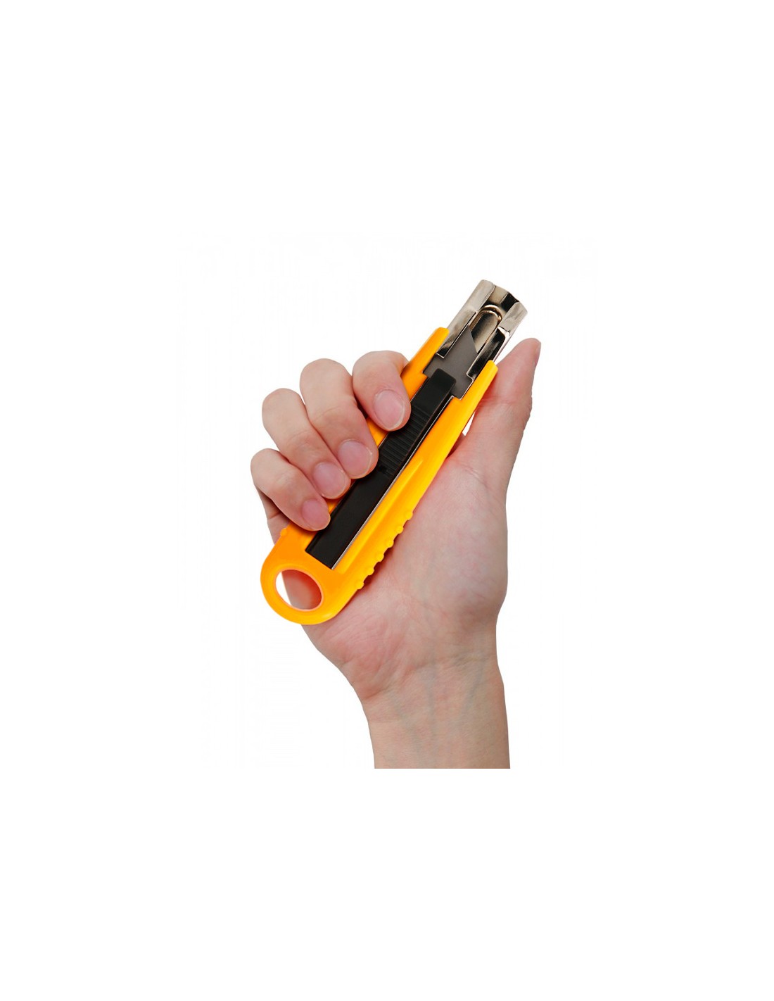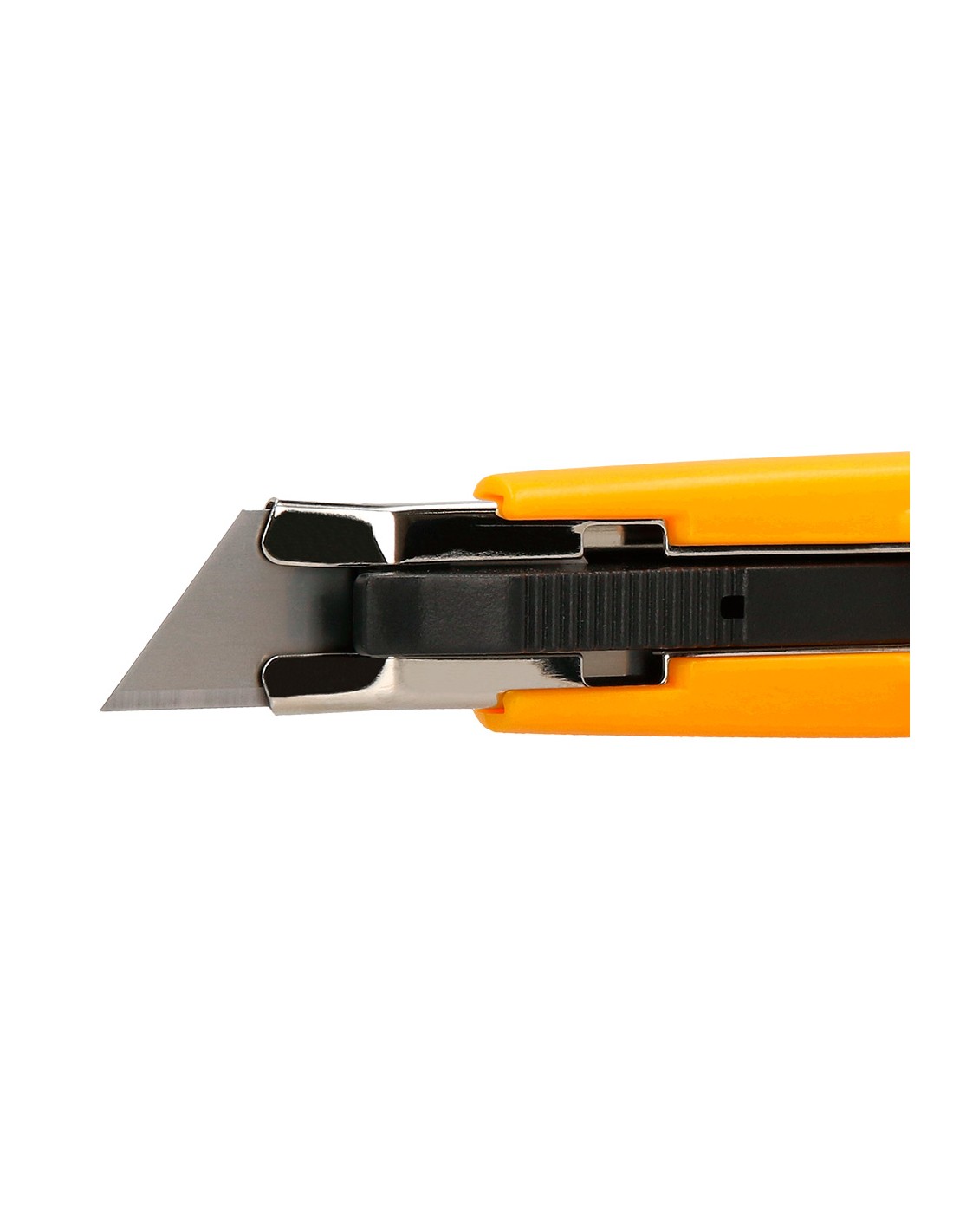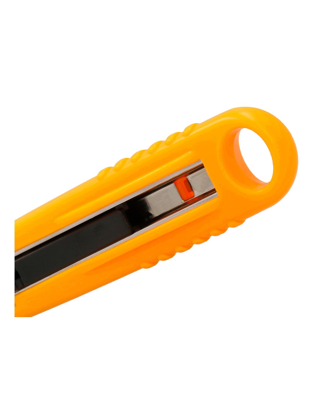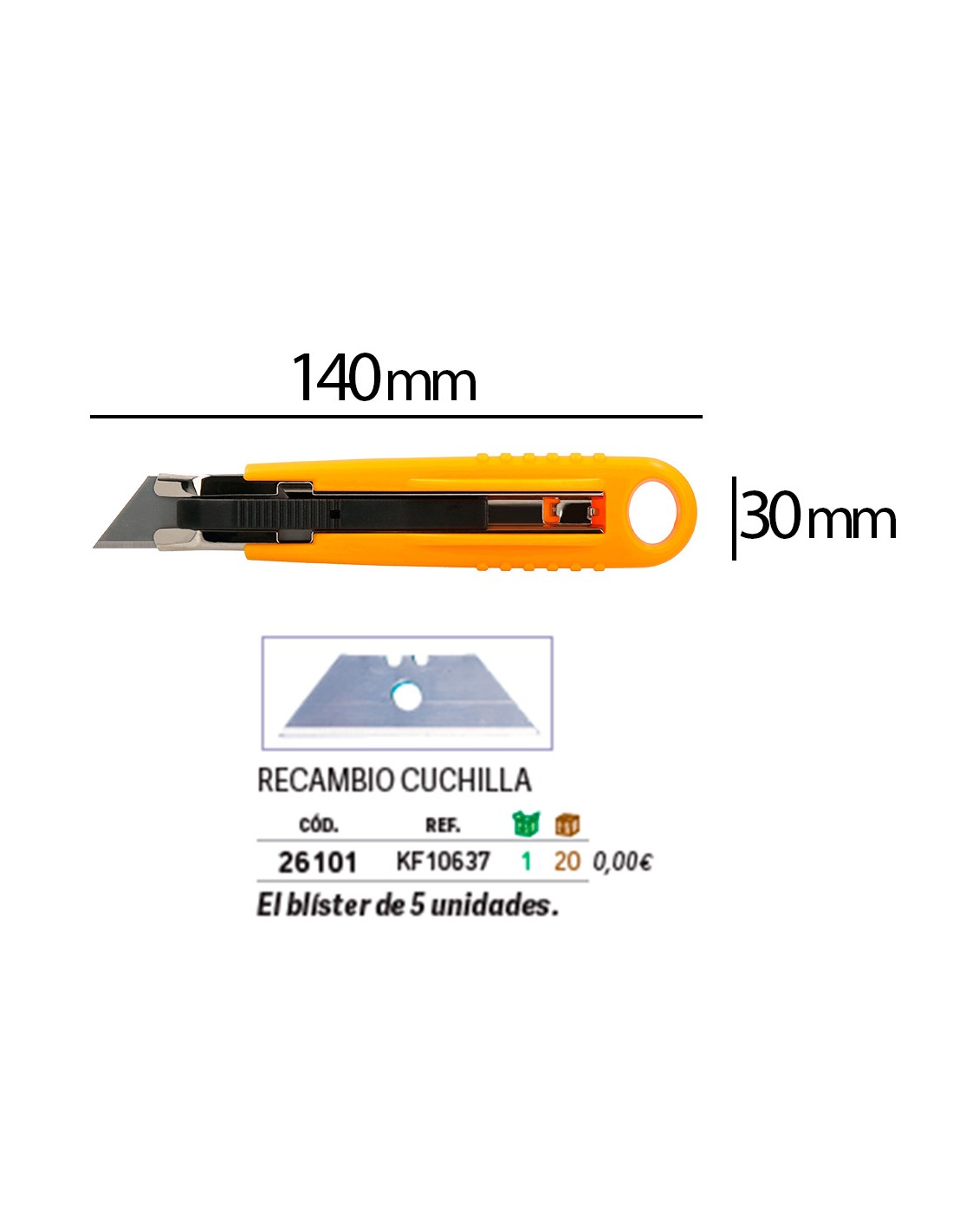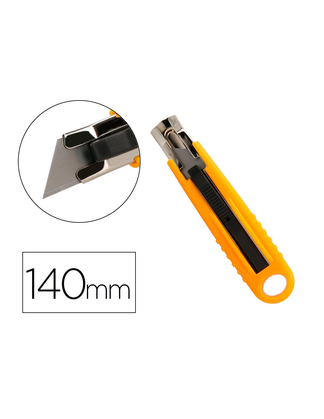 Fabricado en plástico y acero. Cuchilla retráctil de seguridad la cuchilla solo sale al exterior cuándo se pulsa el mecanismo negro y vuelve al interior en el momento en que se deja de presionar, para así evitar que la cuchilla quede en el exterior cuando no se esté usando. Cuchilla de acero de 18 mm de ancho. Colores surtidos amarillo, azul y naranja. Recomendado por gran público y profesionales. Longitud 140 mm. El blíster de 1 unidad.