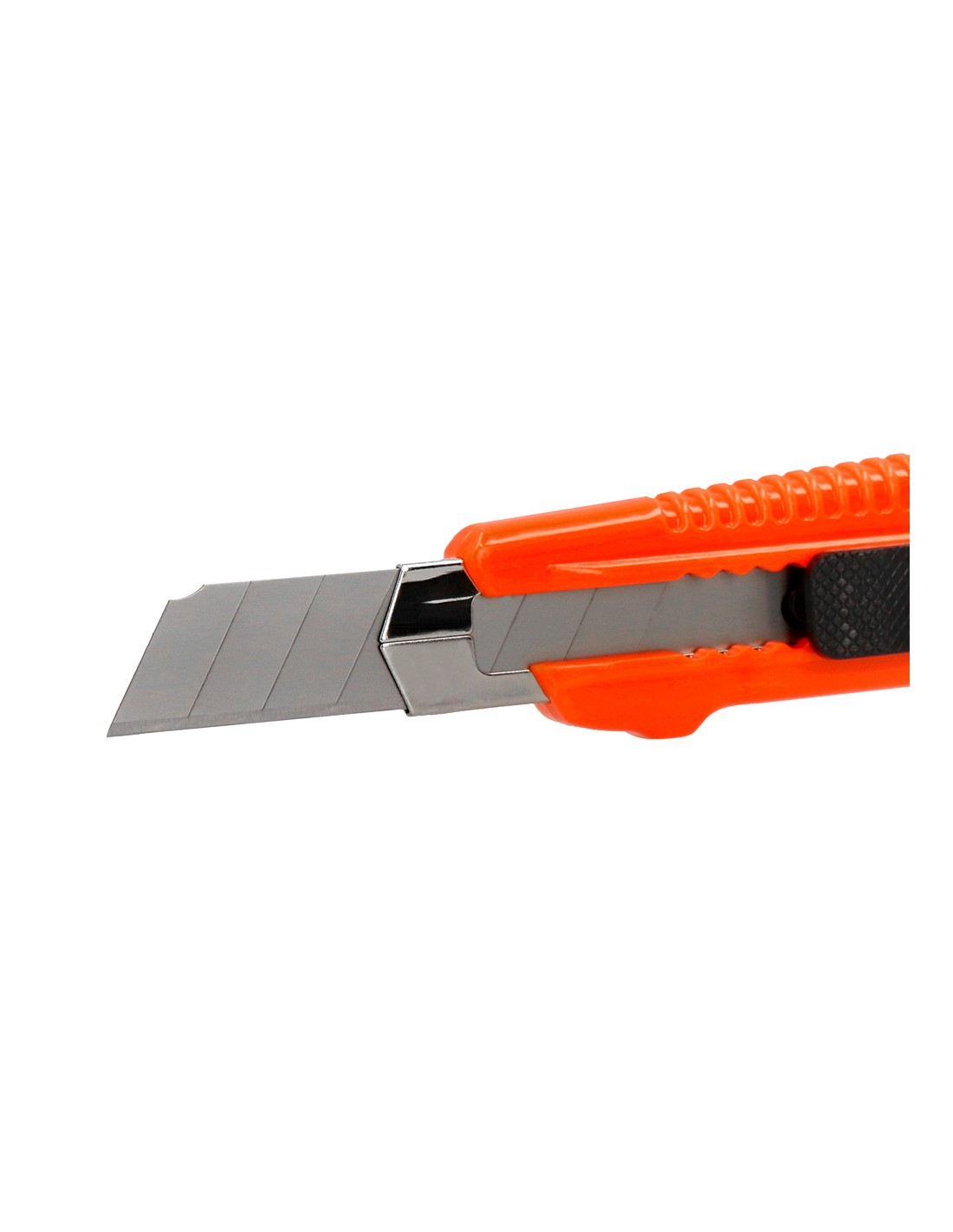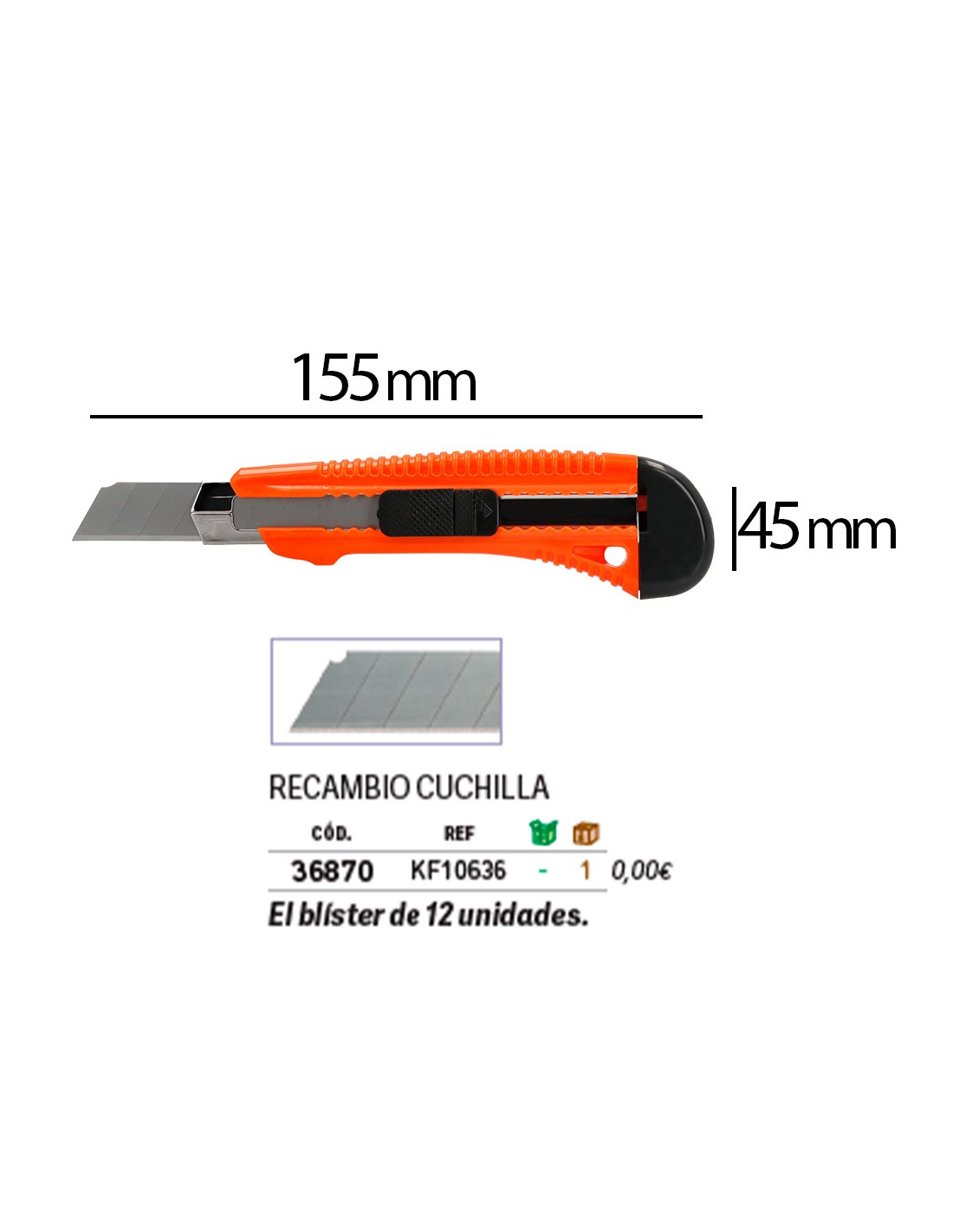 Retráctil e intercambiable. Protector metálico para cuchilla de acero precortado y freno de seguridad. Especial para cortar embalajes de cartón. Cuchilla de 18 mm de ancho. Longitud 155 mm. El blíster de 1 unidad.