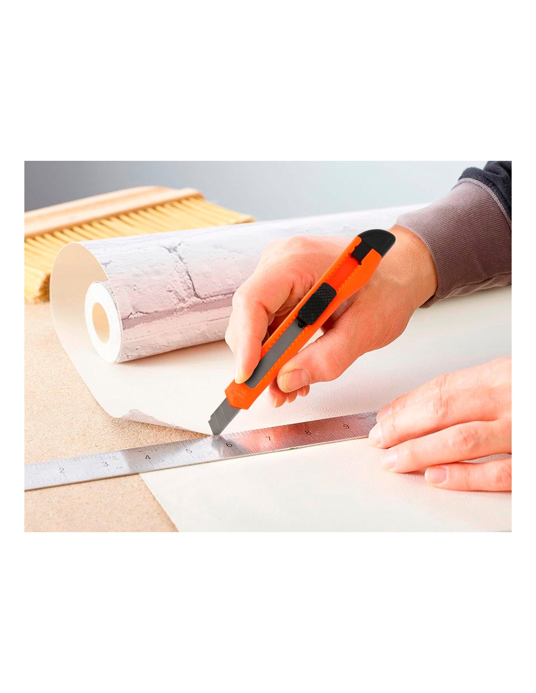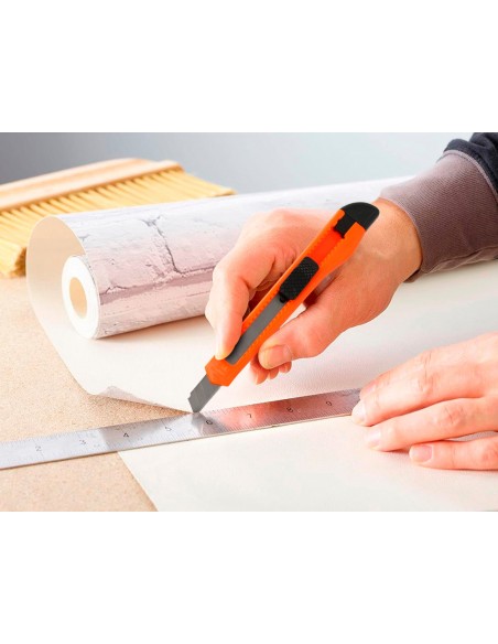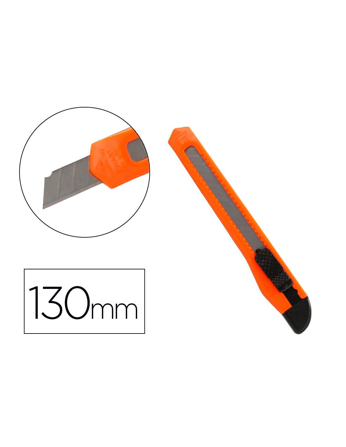 Retráctil e intercambiable. Cuchilla de acero precortado y freno de seguridad. Cuchilla de 9 mm de ancho. Longitud 130 mm. El blíster de 1 unidad.