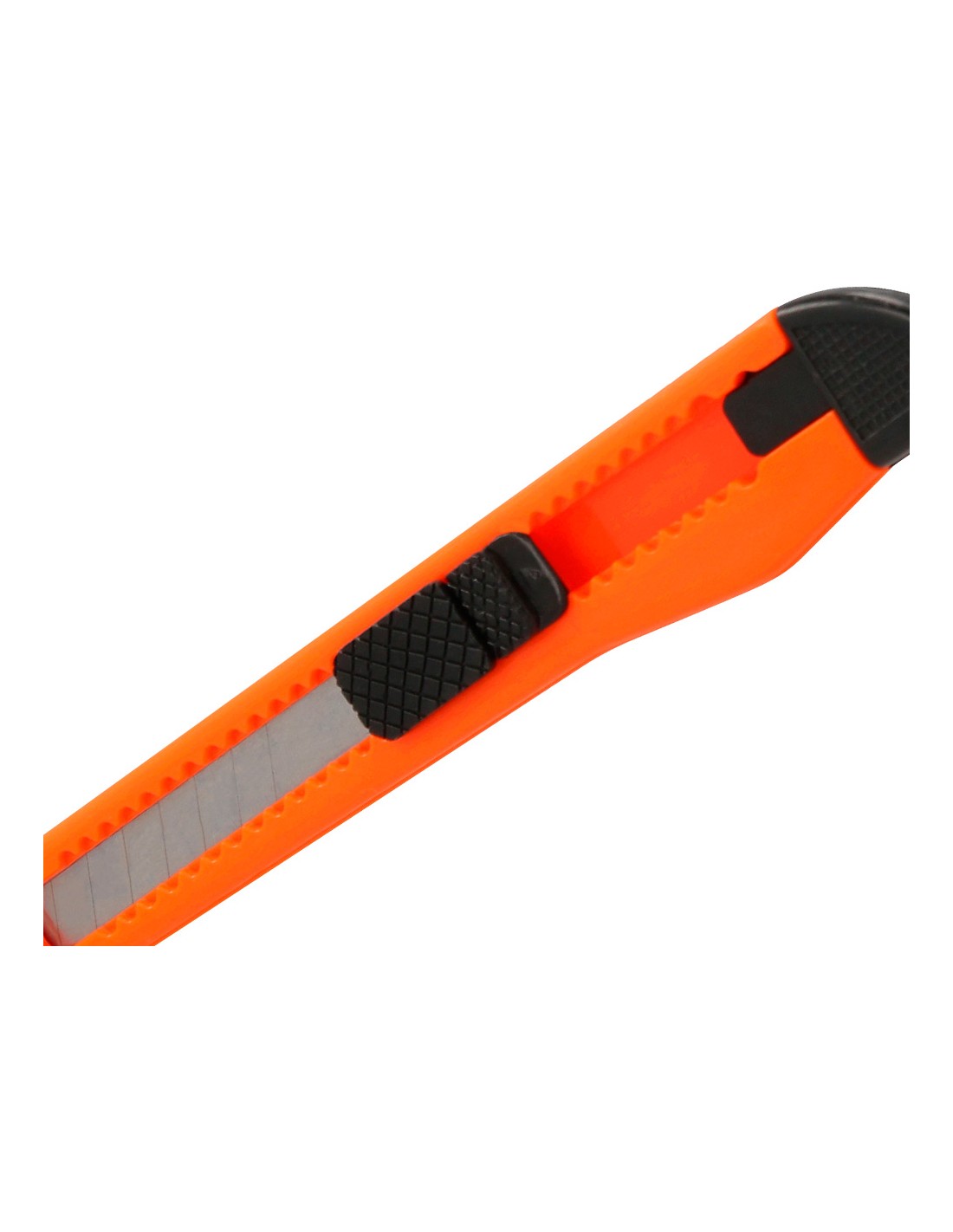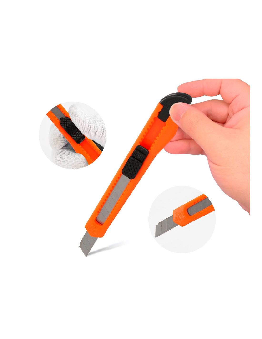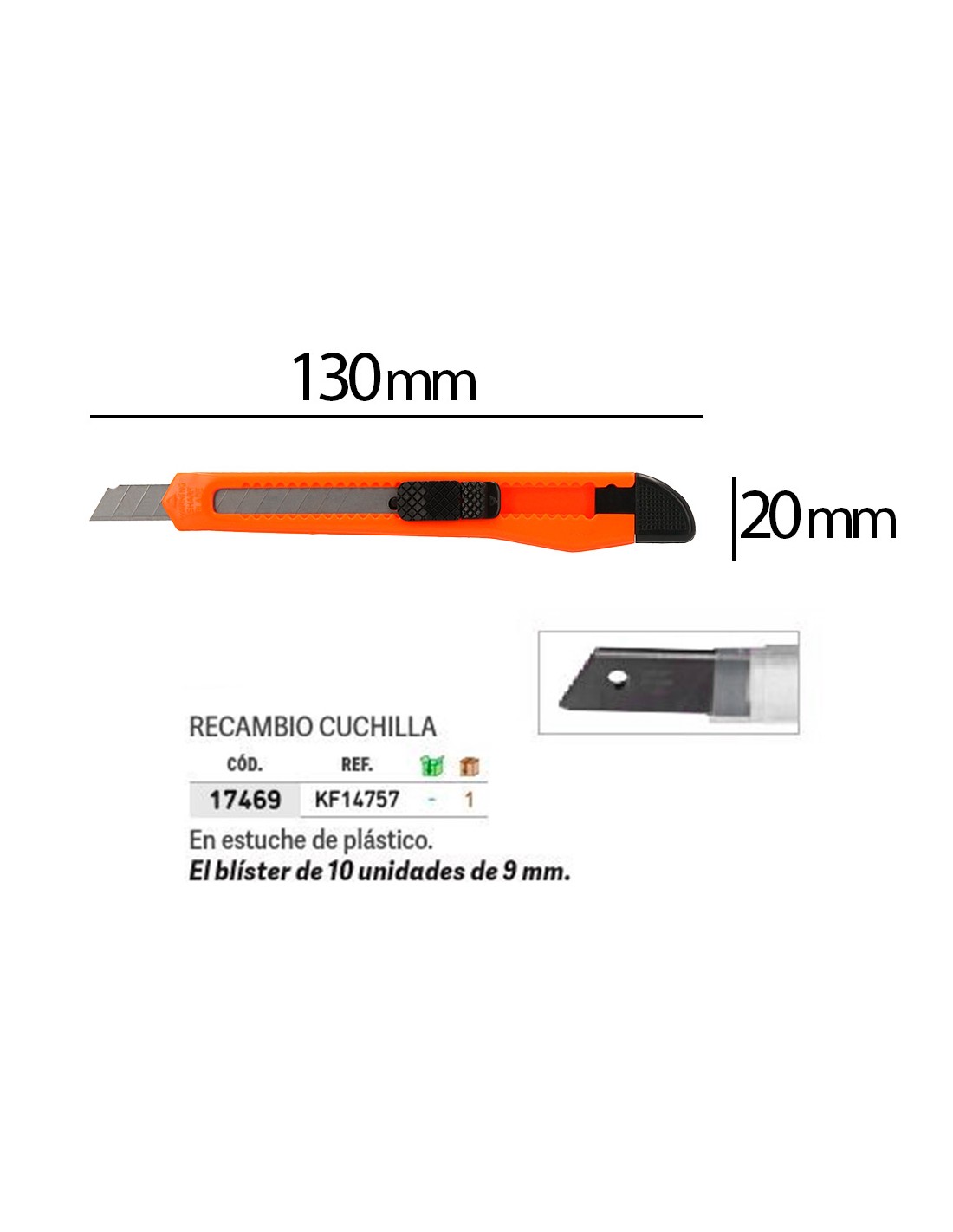 Retráctil e intercambiable. Cuchilla de acero precortado y freno de seguridad. Cuchilla de 9 mm de ancho. Longitud 130 mm. El blíster de 1 unidad.