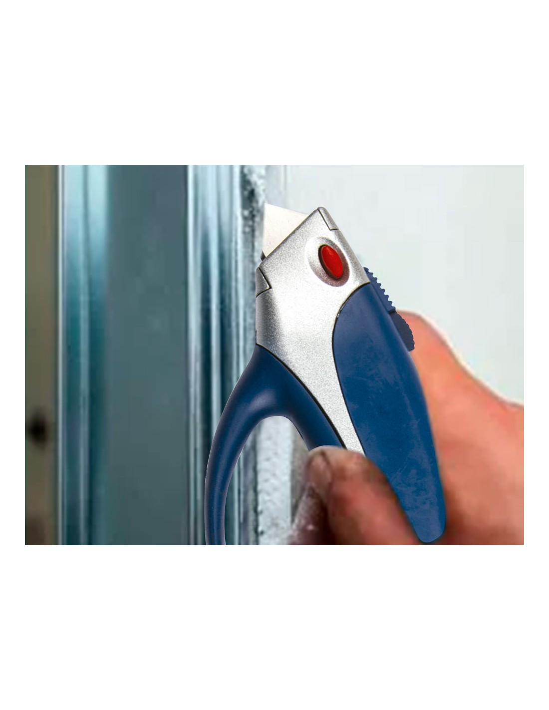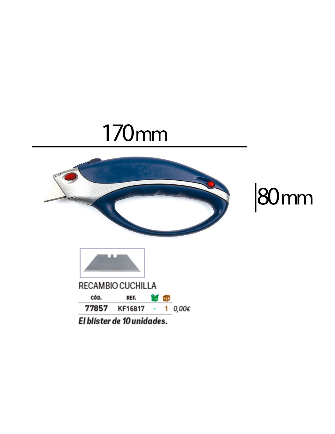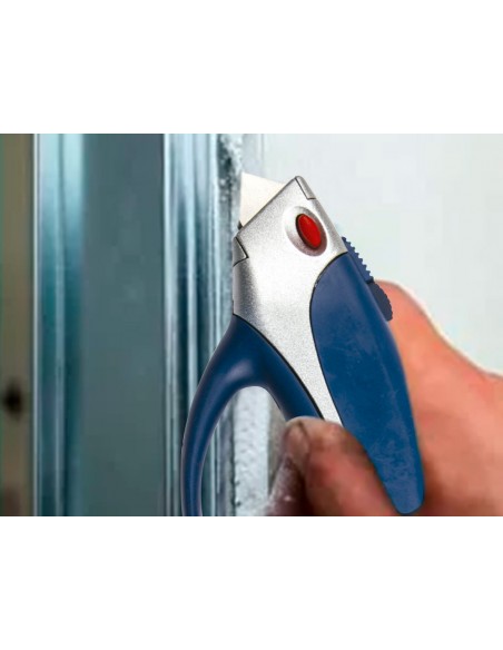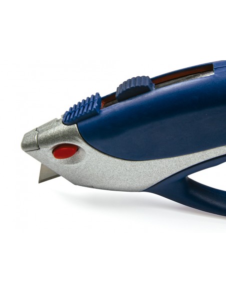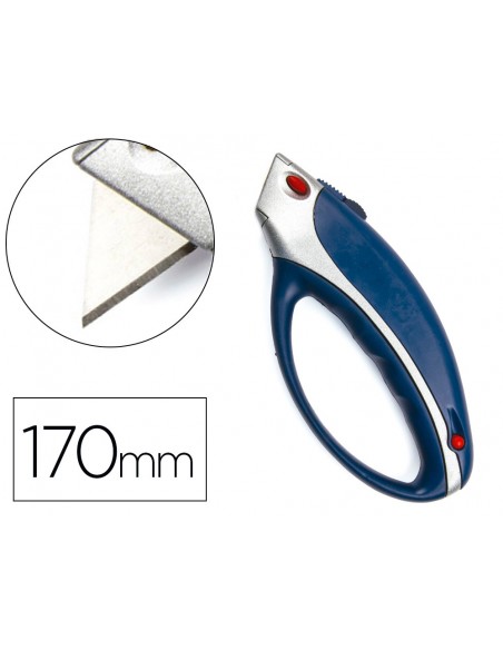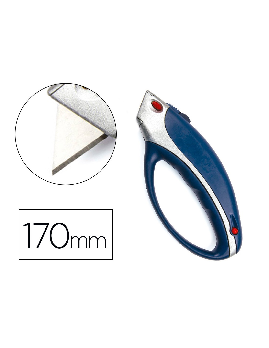 Cuter q-connect xs6200 metalico ancho azul y gris con mango de plastico y compartimento para cuchillas