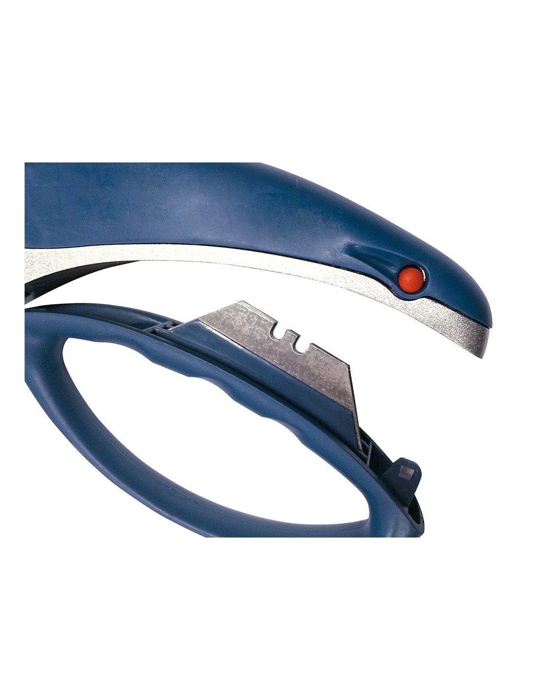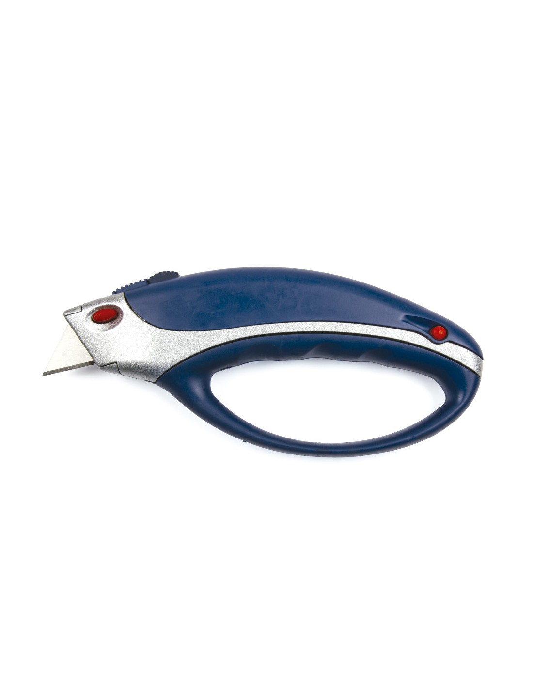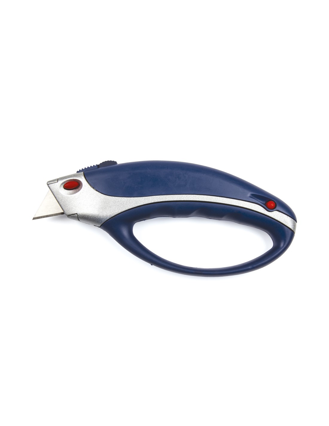 Cuter q-connect xs6200 metalico ancho azul y gris con mango de plastico y compartimento para cuchillas