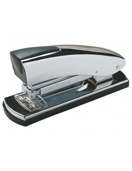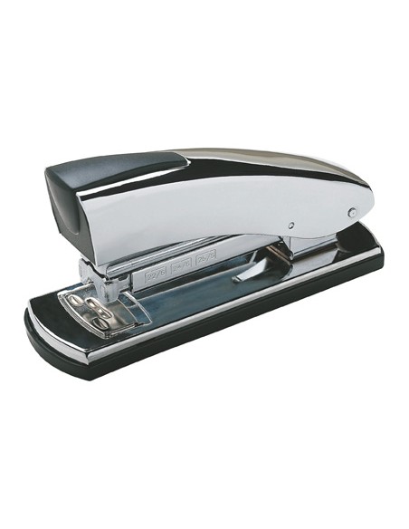 Metálica cromada. Longitud del grapado a 72 mm del borde de la hoja. Carga 2 peines (100 grapas) nº 22/6, 24/6 y 26/6. Con base plástica antideslizante. Con cargador frontal doble guía antiatascos. Incorpora el grapado PGT (Paper Grip Tecnology) para un grapado siempre perfecto. Longitud de la base 135 mm. Medidas 50 x 70 x 150 mm.