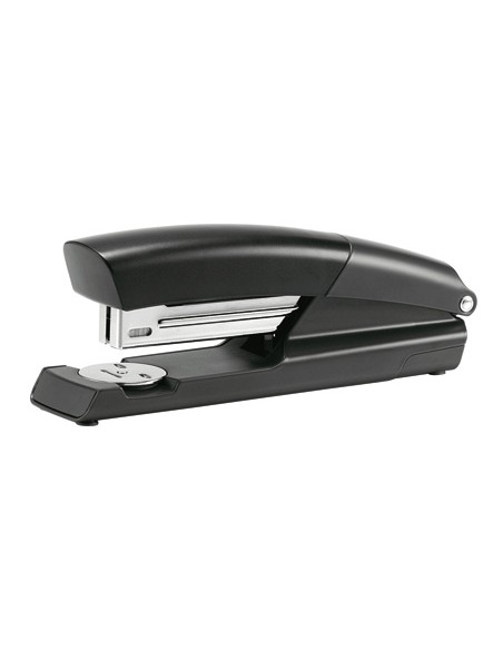 Resistente grapadora de metal para uso cotidiano. Robusta y fiable. La tecnología de impacto directo patentada, así como la utilización de grapas Petrus 22/6-24/6-26/6 o 22/8-24/8-26/8 garantizan siempre un grapado perfecto. Longitud del grapado a 60 mm del borde de la hoja. Carga 3 peines (150 grapas). Con base plástica antideslizante. Preparada para uso intensivo. Con cargador superior doble guía antiatascos. Color negro. Longitud de la base 165 mm. Medidas 42 x 65 x 176 mm.