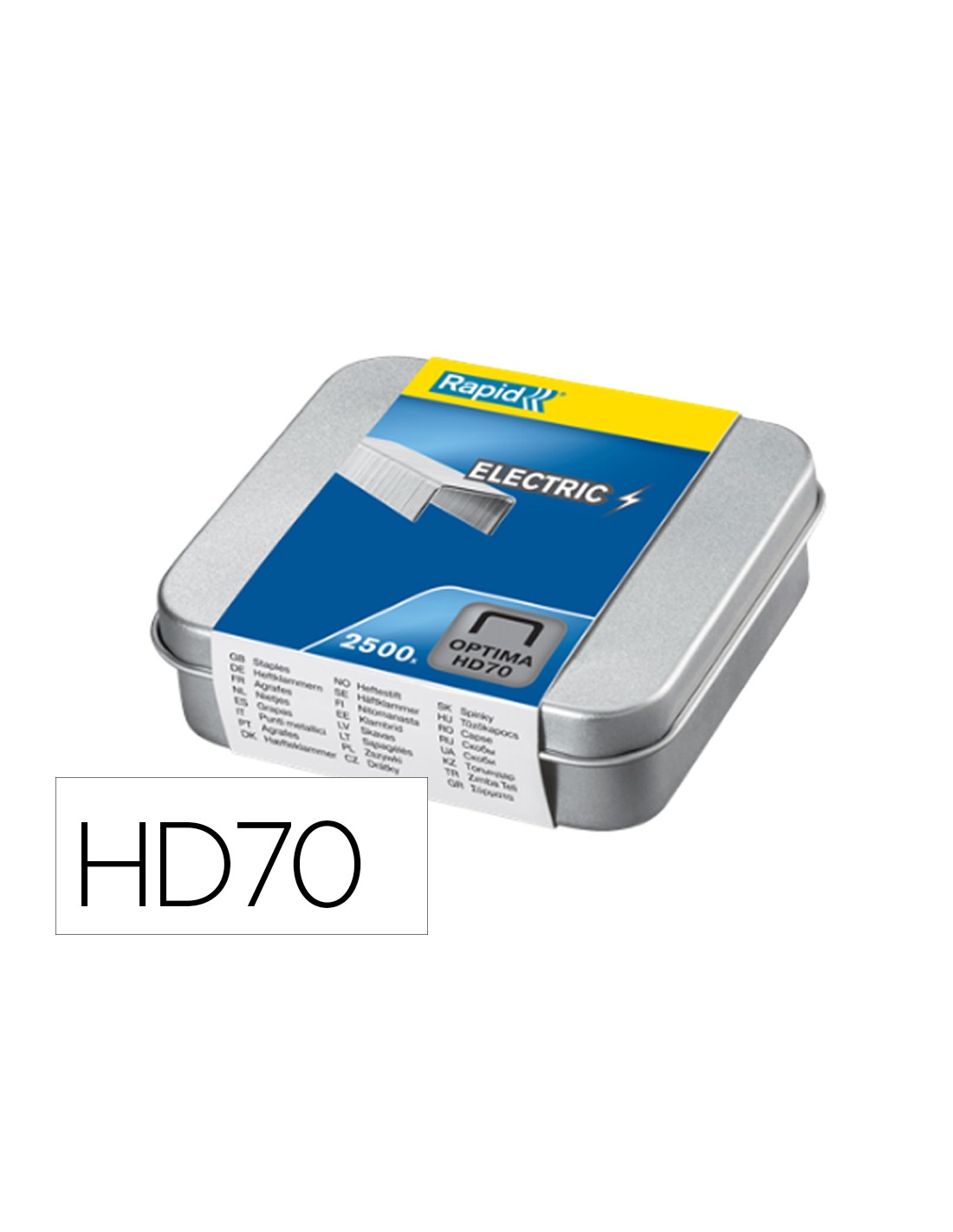 Grapas fabricadas en acero de calidad superior con patas más largas y puntas más afiladas. Indicadas para grapadoras manuales y eléctricas Rexel Optima 70. Caja de aluminio de 2500 grapas.