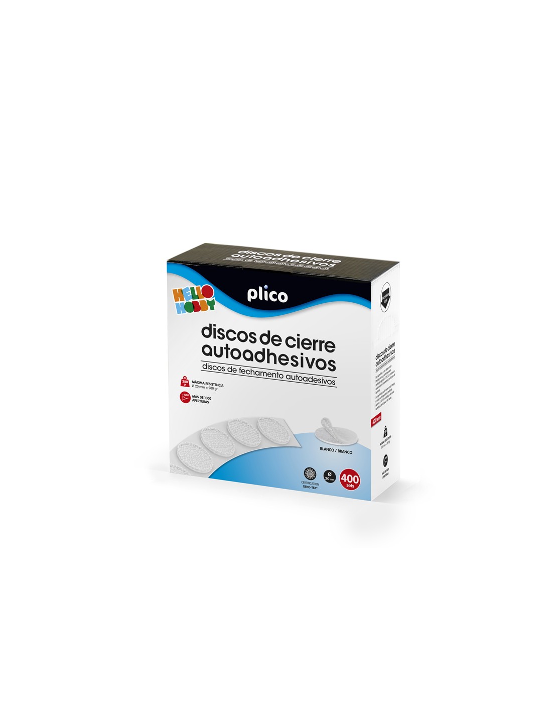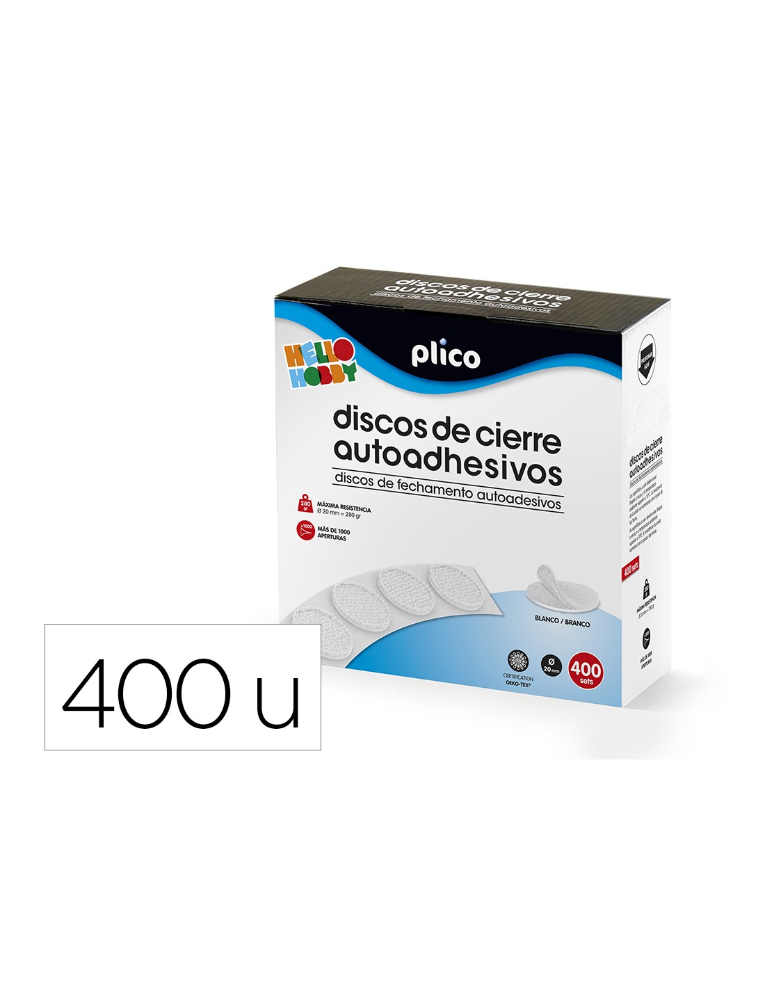 Disco de cierre autoadhesivo macho/hembra, de 20 mm de diámetro. Muy útil en las aulas para sujetar todo tipo de materiales a paredes, cristales y para realizar cierres. No necesita tijeras. Gran adhesividad y resistencia,hasta 280 gr por disco. Resiste más de 1000 aperturas. Caja de 400 unidad es.